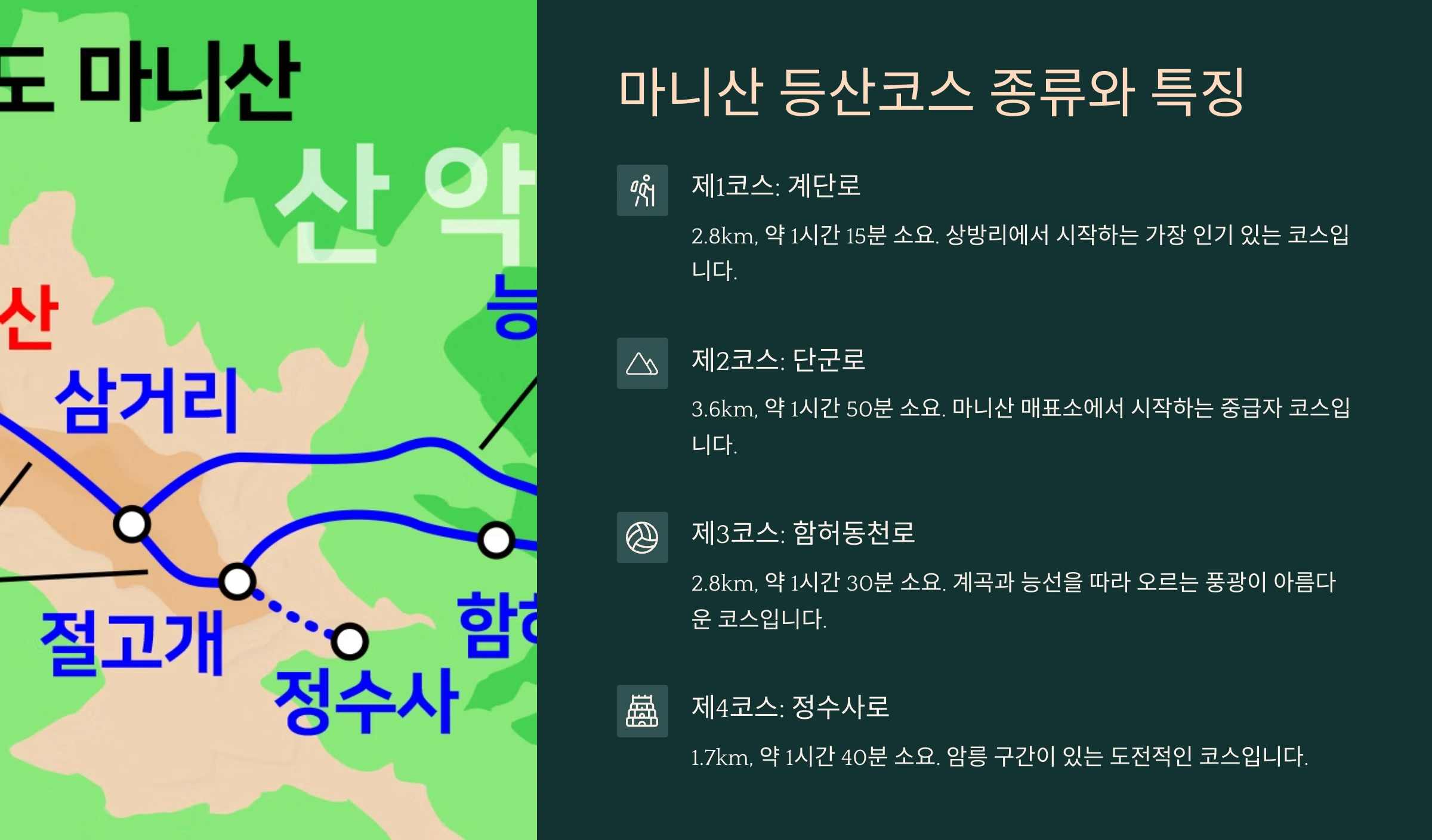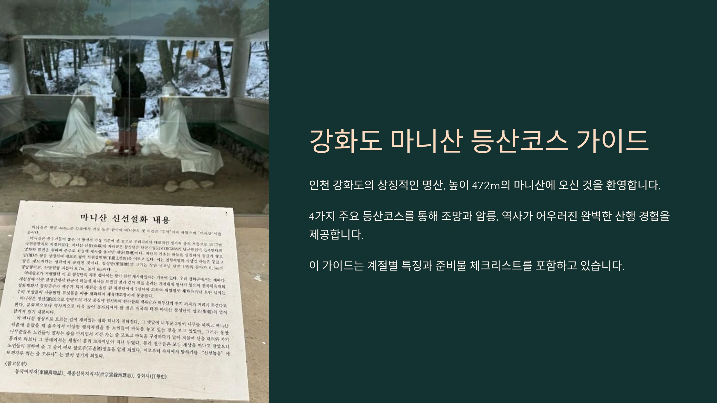 강화도 마니산은 인천 강화군 화도면에 자리한 한국의 100대 명산으로, 해발 472.1m의 비교적 낮은 산이지만 풍부한 매력을 지니고 있습니다. 마니산에는 총 4개의 주요 등산코스가 있으며, 각각 고유한 특징과 난이도를 가지고 있습니다.