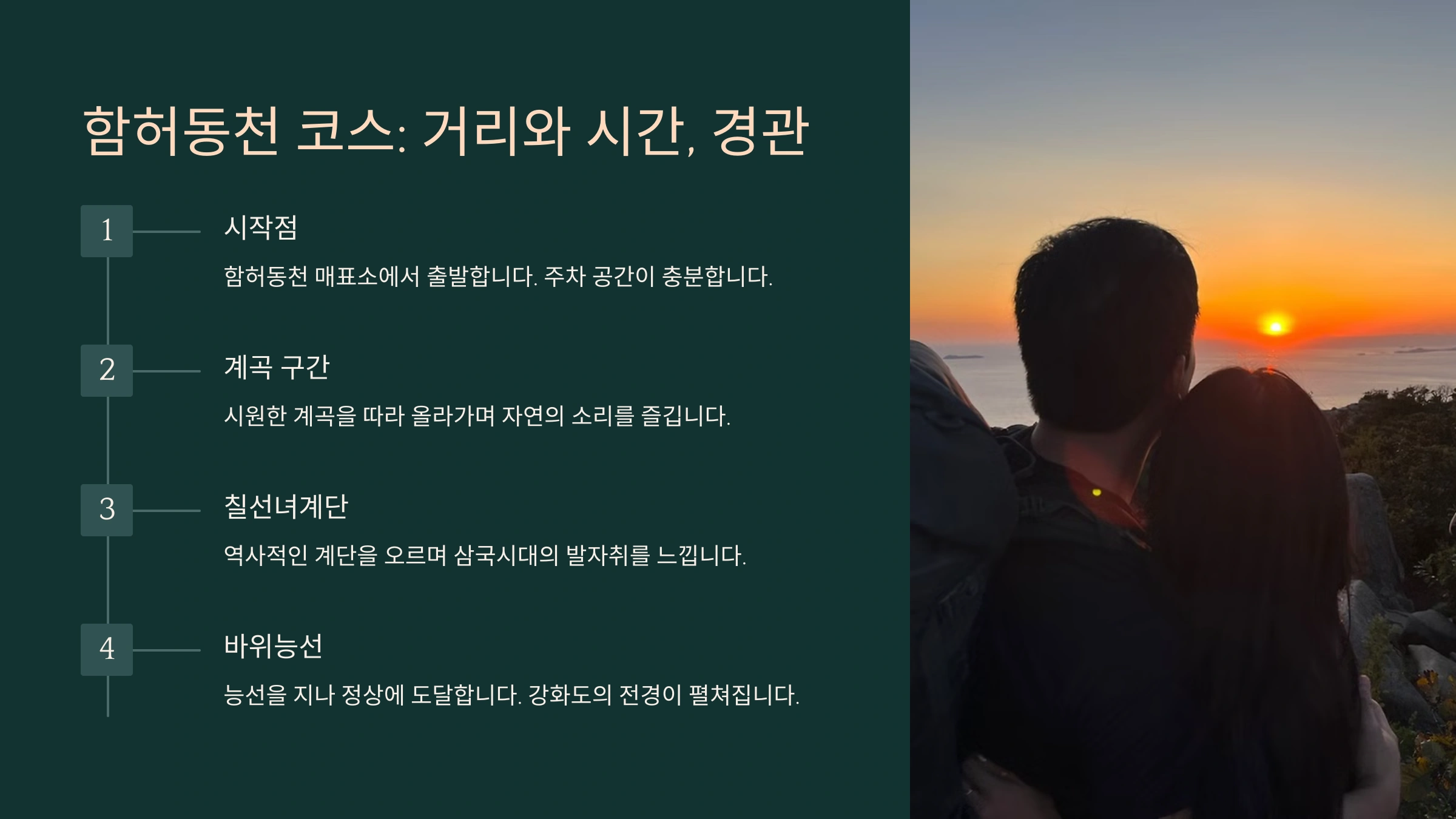 이 코스의 가장 큰 장점은 접근성이 좋다는 점입니다. 차량으로 쉽게 출발지에 도착할 수 있어 대중교통을 이용하는 등산객들에게 편리합니다. 또한 계단이 잘 정비되어 있어 길을 잃을 걱정이 적고, 정상에 오르면 강화도 전역을 한눈에 조망할 수 있는 탁 트인 전망이 기다리고 있습니다.