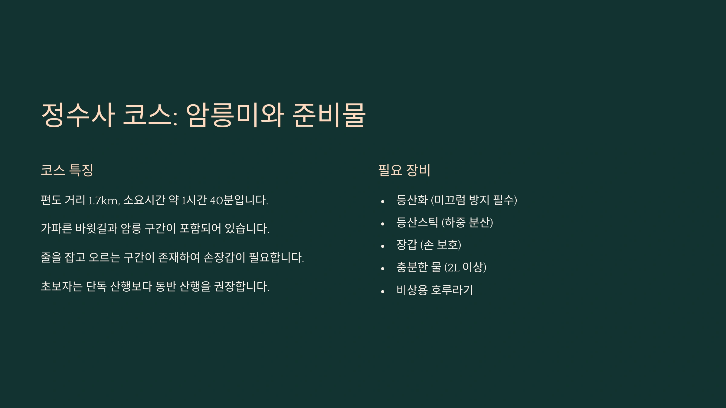 특히 정수사 코스는 매점이 없어 충분한 간식과 물을 준비하는 것이 중요합니다. 계절에 따라 방한복이나 쿨링웨어를 적절히 준비하고, 갑작스러운 기상 변화에 대비한 방수 재킷은 필수입니다.