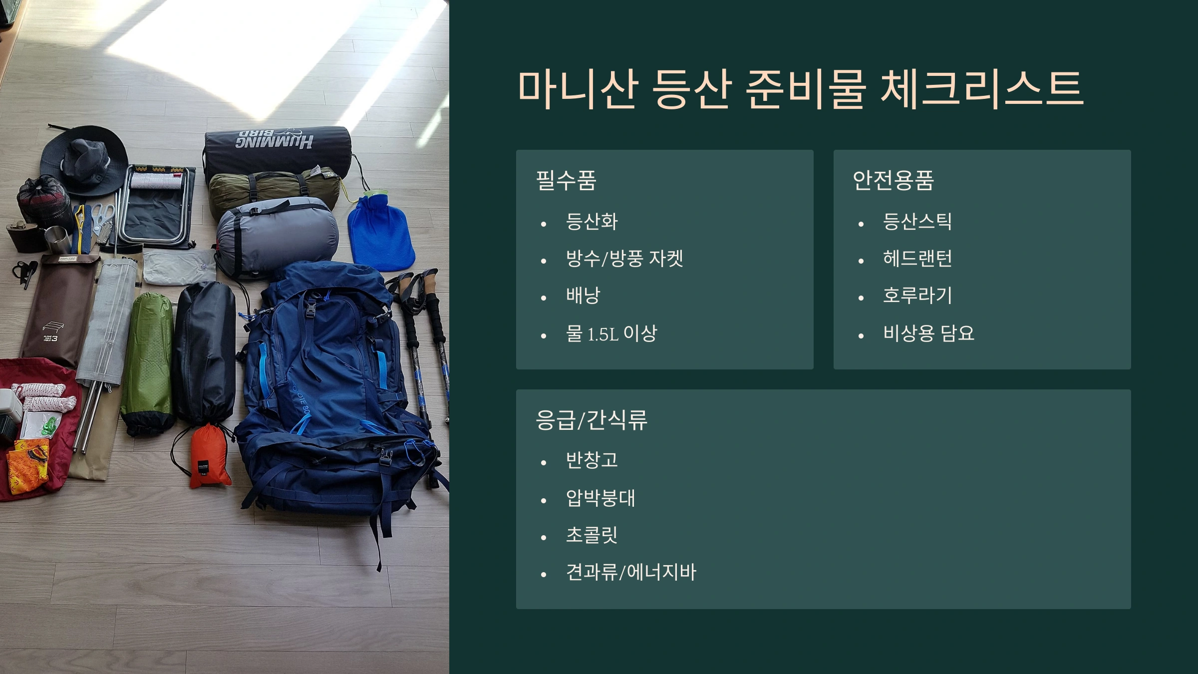 강화도 마니산 등산을 계획하고 계신다면, 아래의 필수 준비물을 꼼꼼히 체크하여 안전하고 즐거운 산행이 되도록 준비해야 합니다.