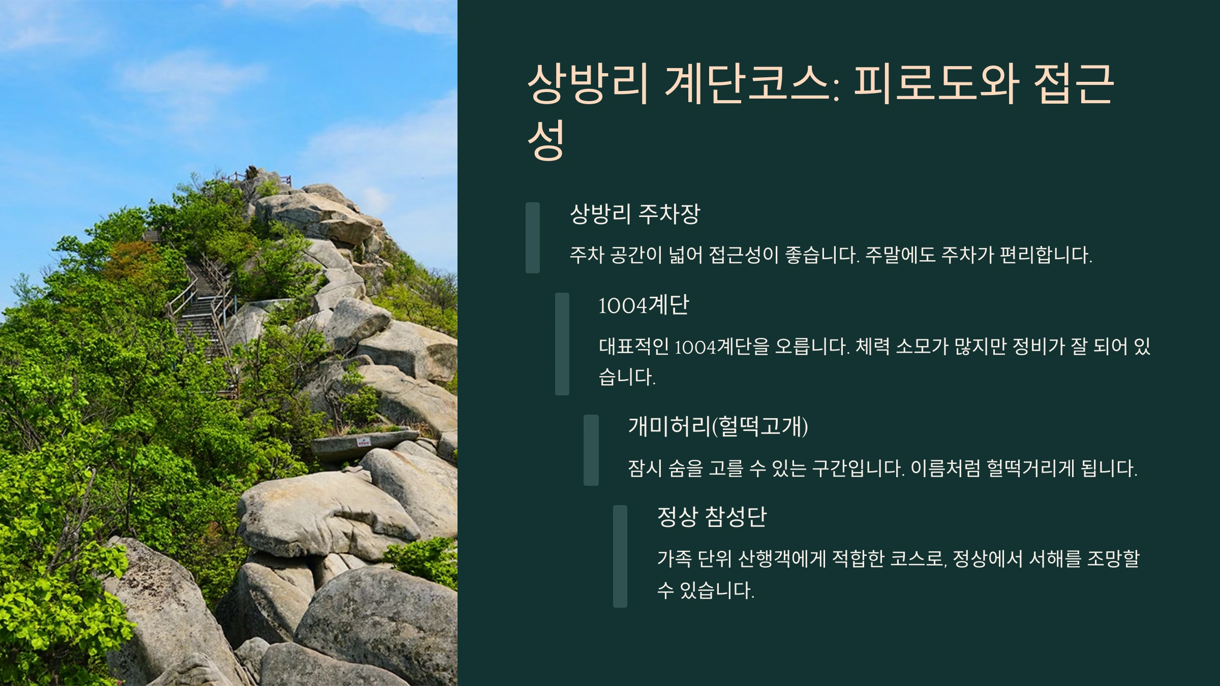 계단 구간이 많다 보니 발목 보호가 특히 중요한 코스입니다. 발목을 잘 잡아주는 등산화를 착용하고, 하산 시에는 무릎에 부담이 가지 않도록 천천히 내려오는 것이 좋습니다. 체력 단련을 목적으로 하는 등산객이나 정해진 길을 따라 안전하게 등산하고 싶은 초보자들에게 적합한 코스입니다.