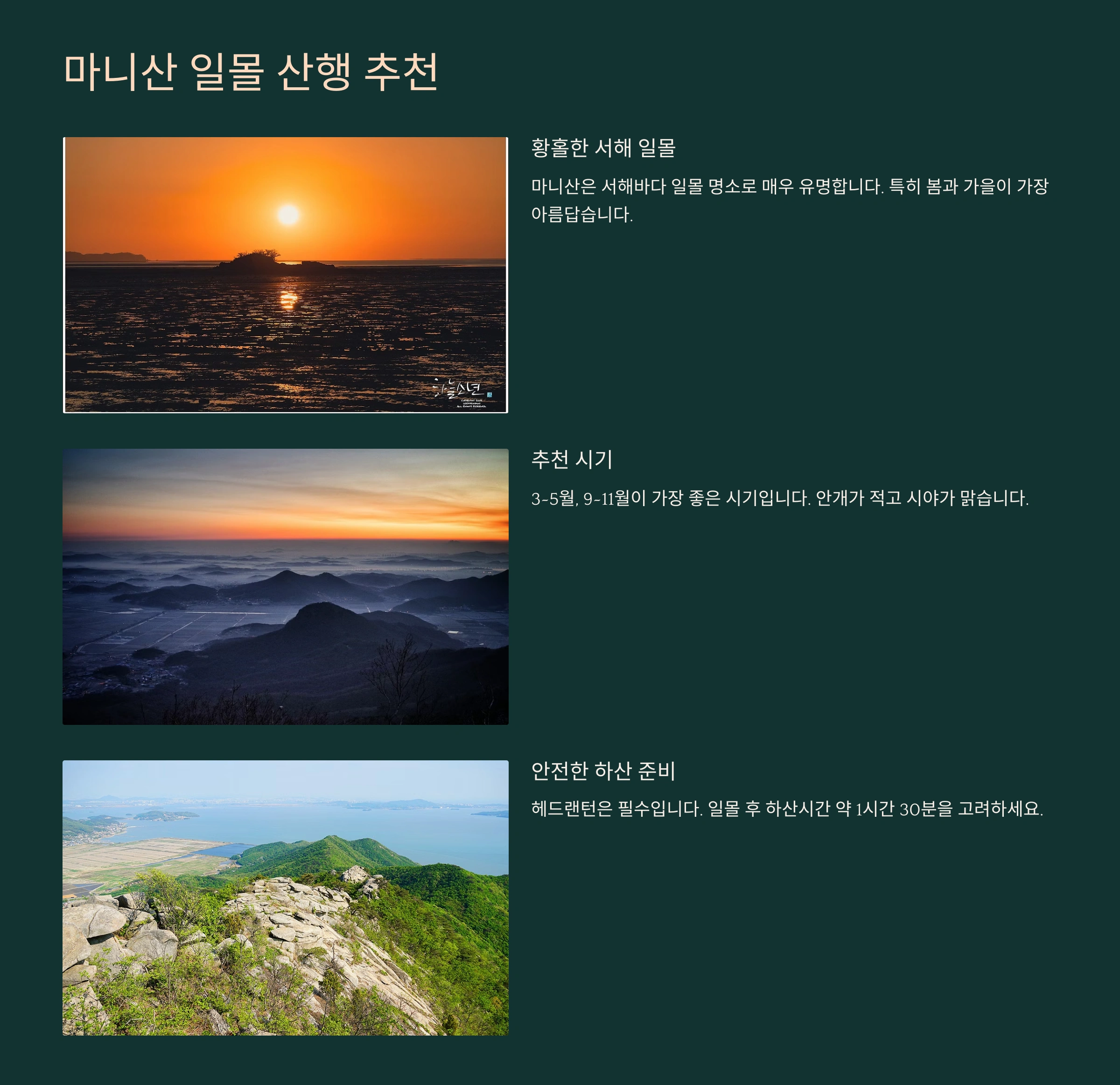 일몰 시간보다 최소 4시간 전에 출발하는 것을 권장합니다. 이렇게 하면 정상에 도착해 여유롭게 자리를 잡고 서해에 천천히 내려가는 태양의 장관을 감상할 수 있습니다. 특히 맑은 날에는 서해의 다양한 섬들과 어우러진 석양이 그림 같은 풍경을 선사합니다.