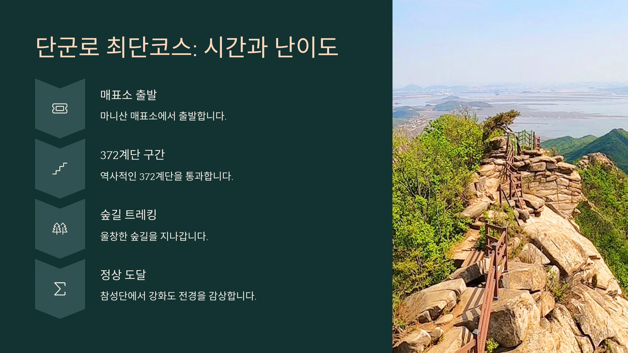 코스 전반적으로 등산로가 잘 정비되어 있어 길을 잃을 위험은 적지만, 정상부 암릉 구간에서는 미끄러지지 않도록 주의해야 합니다. 접지력이 좋은 등산화 착용은 필수이며, 등산 스틱을 활용하면 무릎 부담을 줄이는 데 도움이 됩니다. 강화도 마니산의 코스 중 가장 효율적으로 정상을 정복하고 싶다면 단군로 최단코스가 최적의 선택이 될 것입니다.