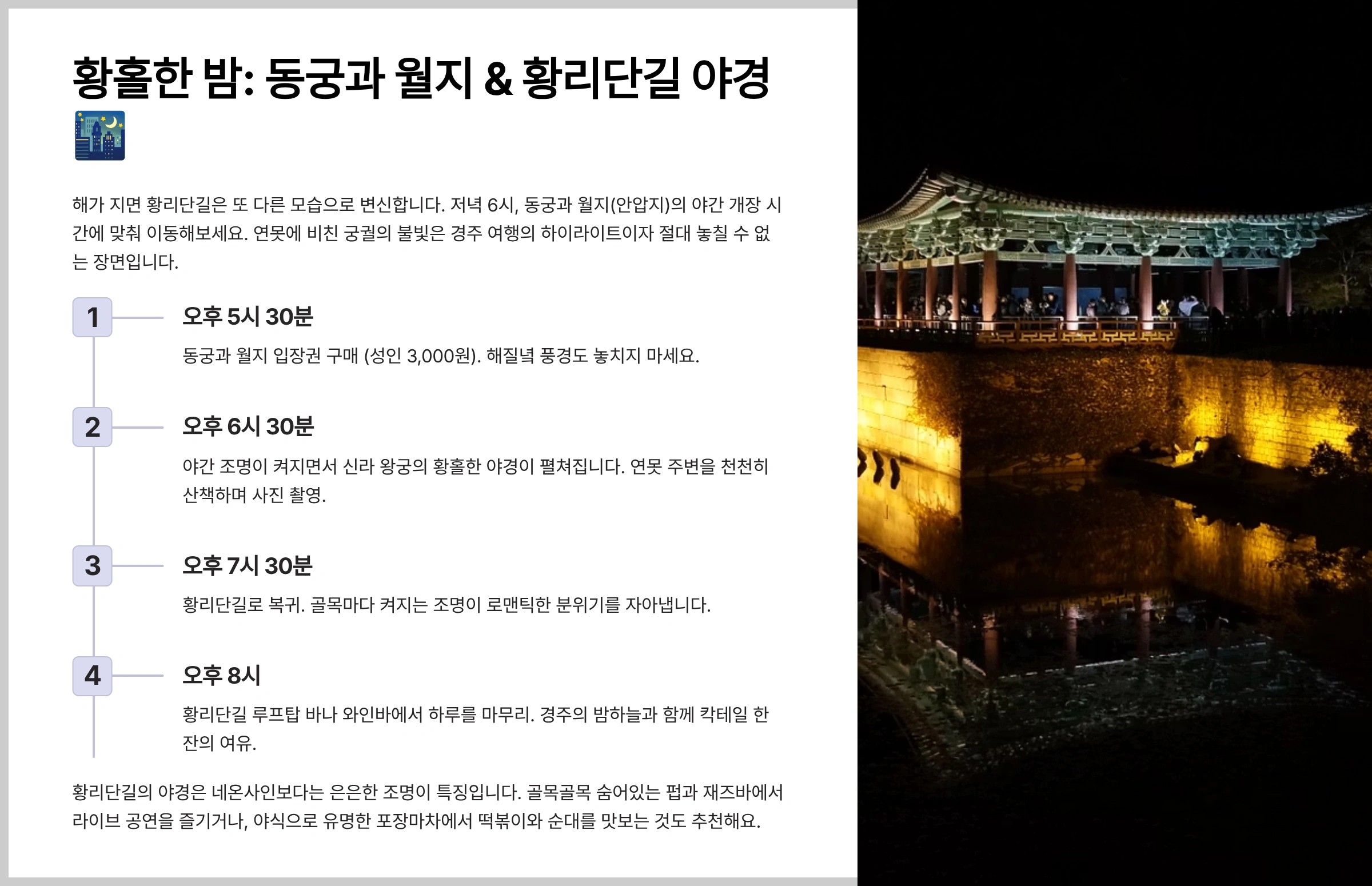 이 글을 통해 여러분이 2025년 경주 황리단길에서의 하루를 최고의 경험으로 만들 수 있기를 진심으로 바랍니다. 제가 직접 발로 뛰며 얻은 최신 정보와 경험이 여러분의 여행에 실질적인 도움이 되기를 희망하며, 신라 천년의 고도 경주에서 잊지 못할 아름다운 추억을 많이 만드시길 응원합니다. 황리단길은 언제나 새로운 모습과 이야기로 여러분을 기다리고 있을 것입니다. 궁금한 점이 있다면 언제든 다시 이 글을 찾아주세요! 여러분의 성공적인 황리단길 여행을 기원합니다.