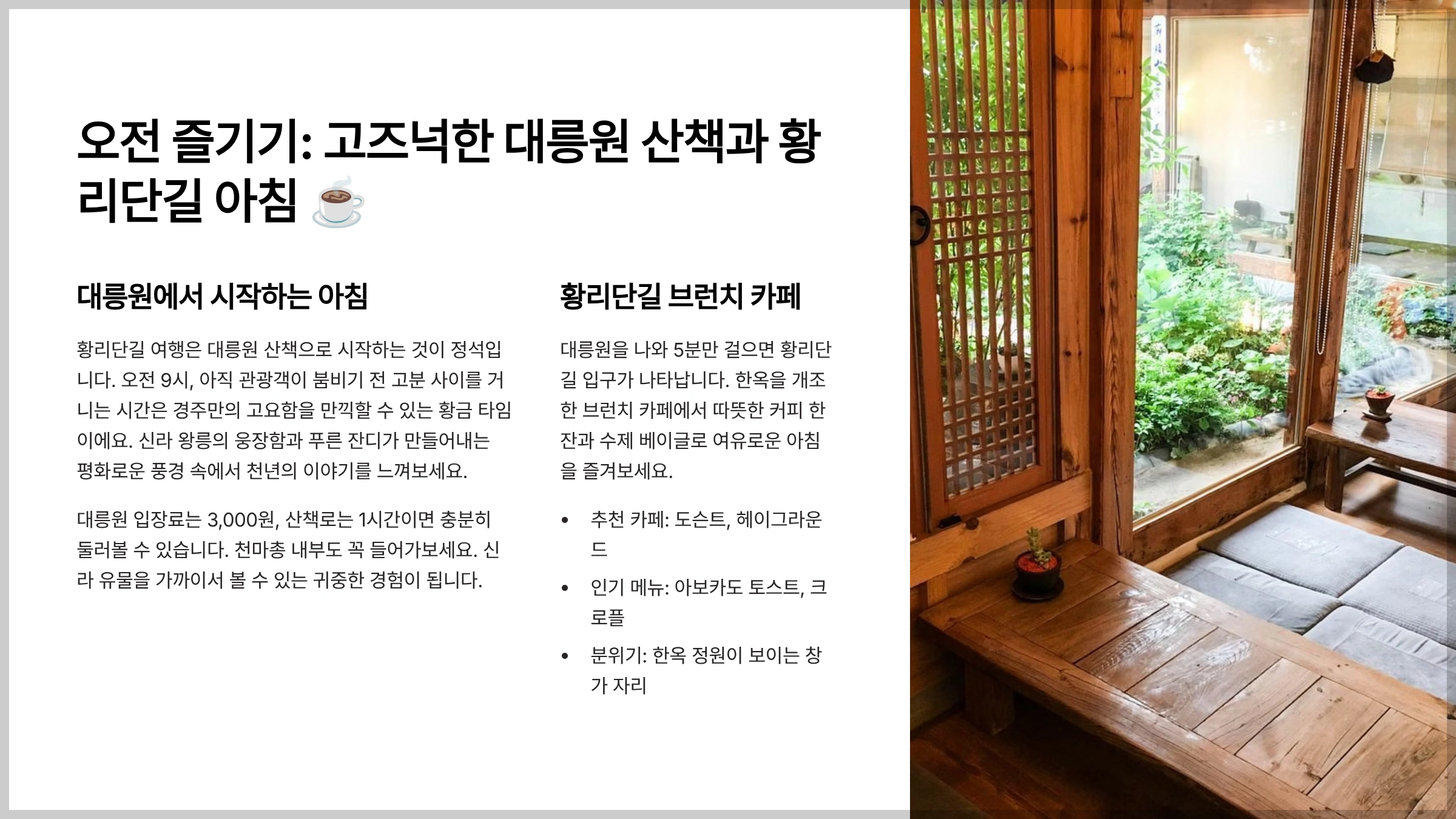 이 글을 통해 여러분은 고즈넉한 한옥의 정취 속에서 맛있는 음식과 커피를 즐기고, 신라 천년의 역사 속을 거닐며, 황홀한 야경으로 하루를 마무리하는 완벽한 가이드를 얻게 될 것입니다. 저와 함께 잊지 못할 황리단길 하루 여행을 떠나보시죠!