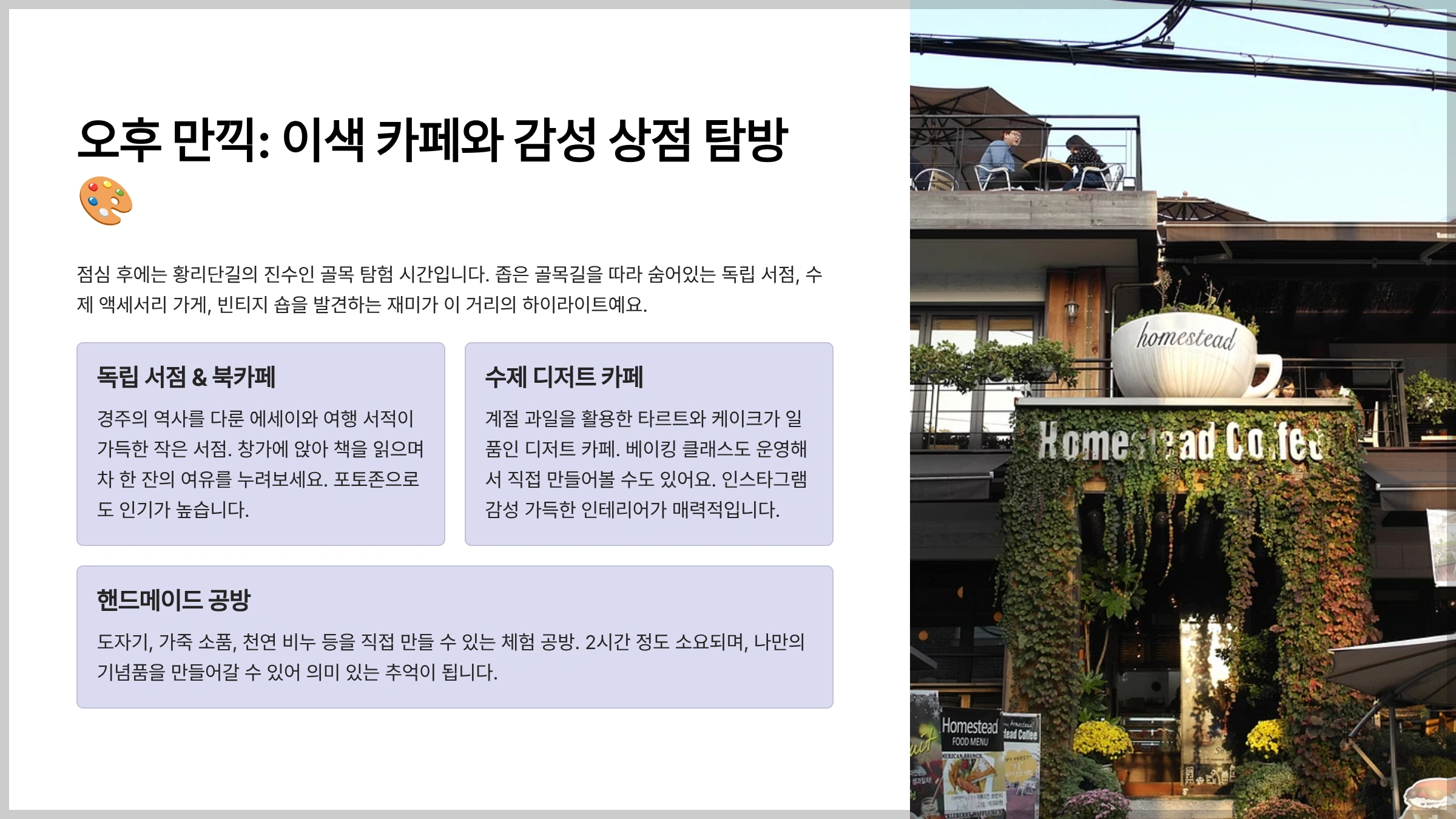 | 황리단길 메인 거리 | 카페, 맛집, 상점 밀집 | 2시간 ~ 3시간 (식사/카페 포함) |