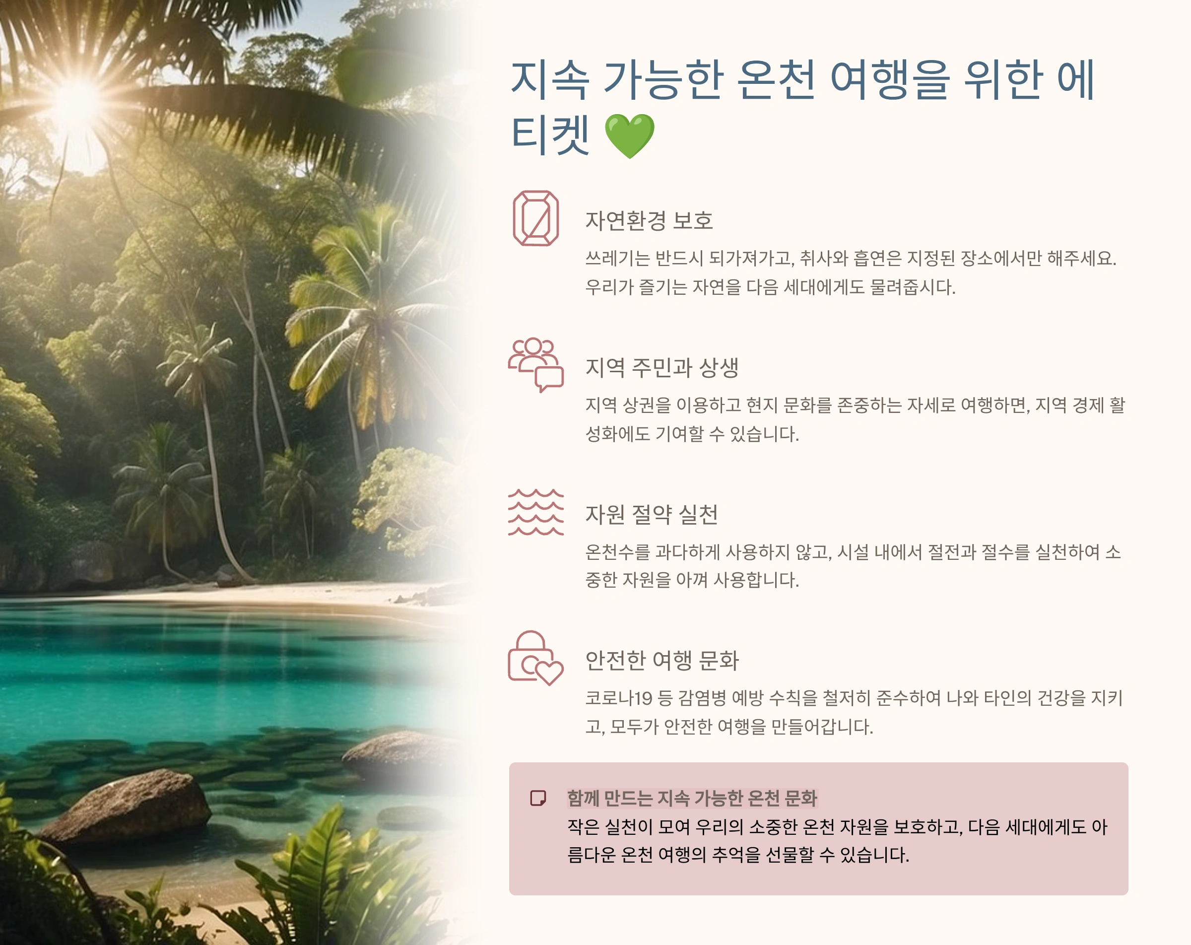 이러한 에티켓을 지키며 온천 여행을 한다면, 우리 모두가 더욱 쾌적하고 의미 있는 경험을 할 수 있을 것이라고 확신합니다. 지속 가능한 온천 여행은 우리 모두의 작은 실천에서 시작됩니다.