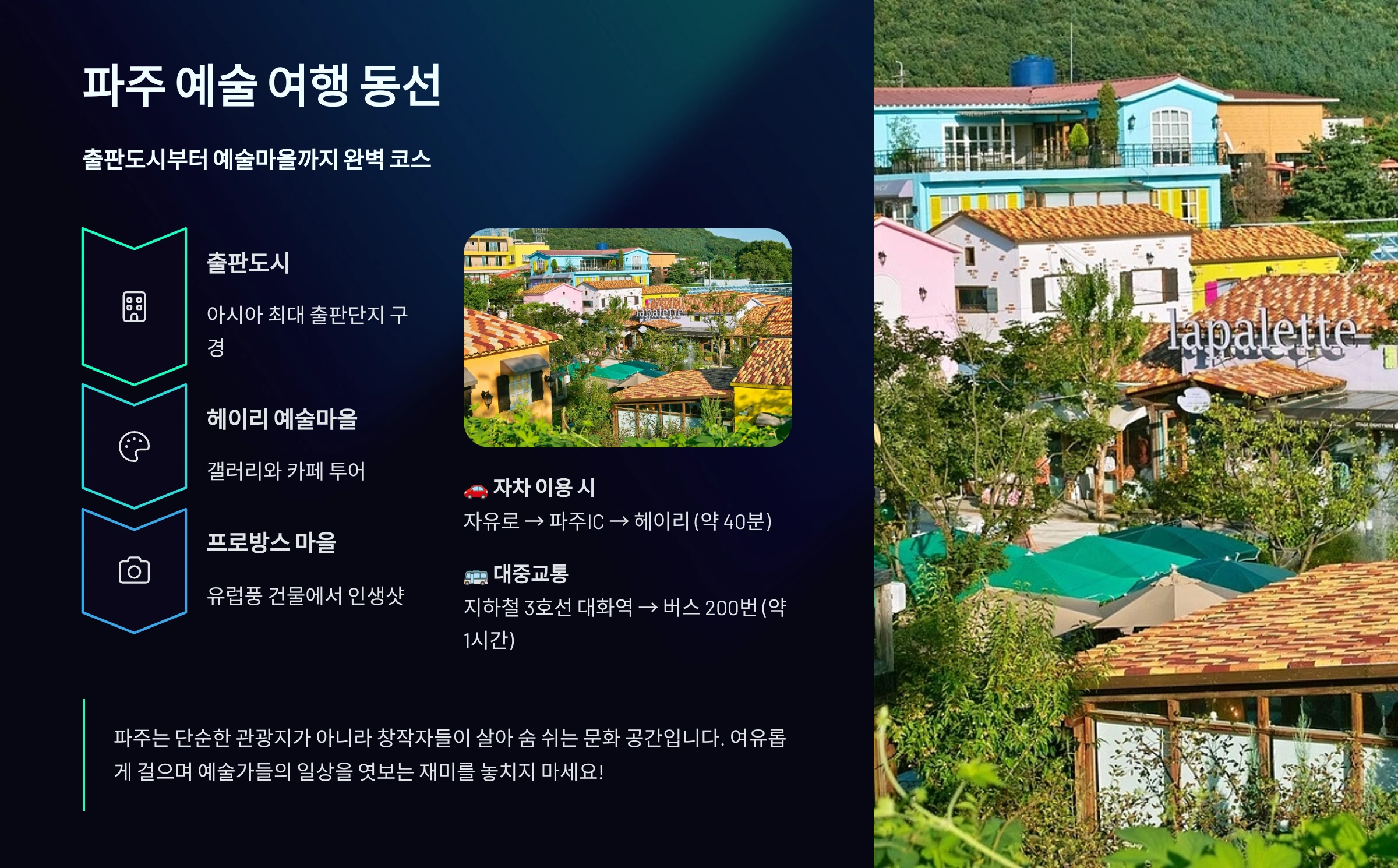 파주: 합정역에서 2200번 버스를 타면 헤이리 예술마을과 파주 출판도시까지 한 번에 갈 수 있습니다. 헤이리 마을 내에서는 순환 버스를 이용하면 편리합니다.