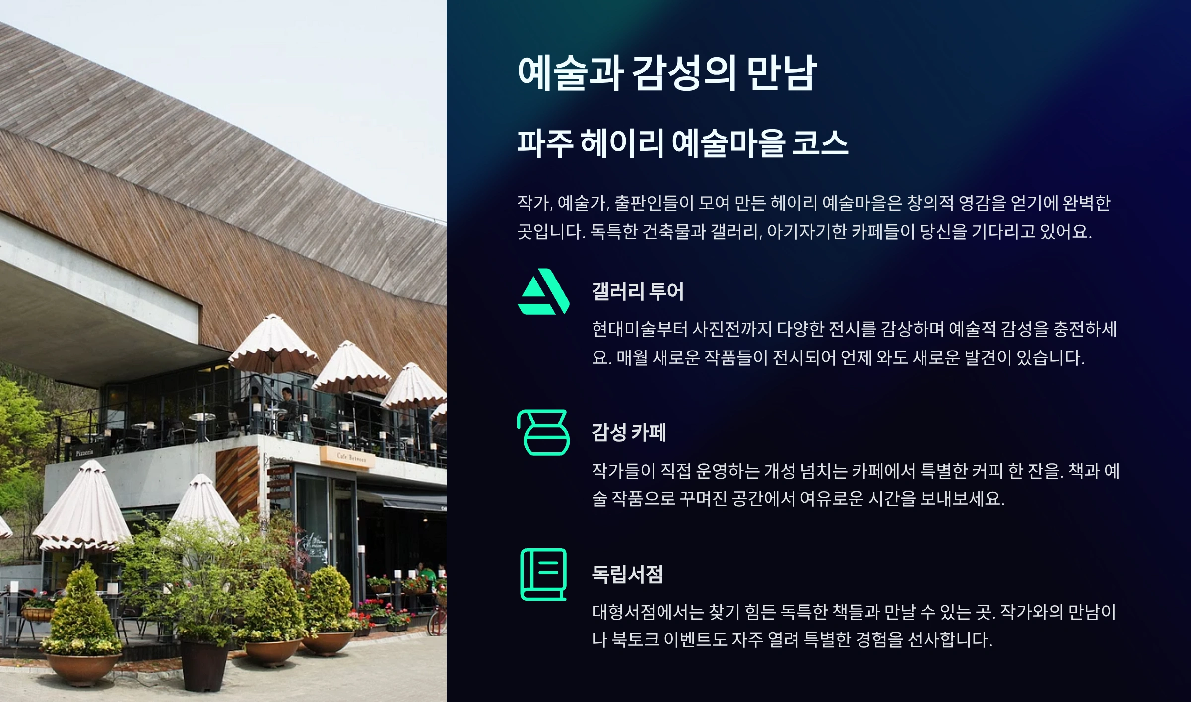 헤이리에는 분위기 좋은 이탈리안 레스토랑이나 퓨전 한식 맛집이 많습니다. '잇탈리'나 '농부의 식탁' 등 평점 높은 곳을 미리 예약하는 것을 추천합니다.