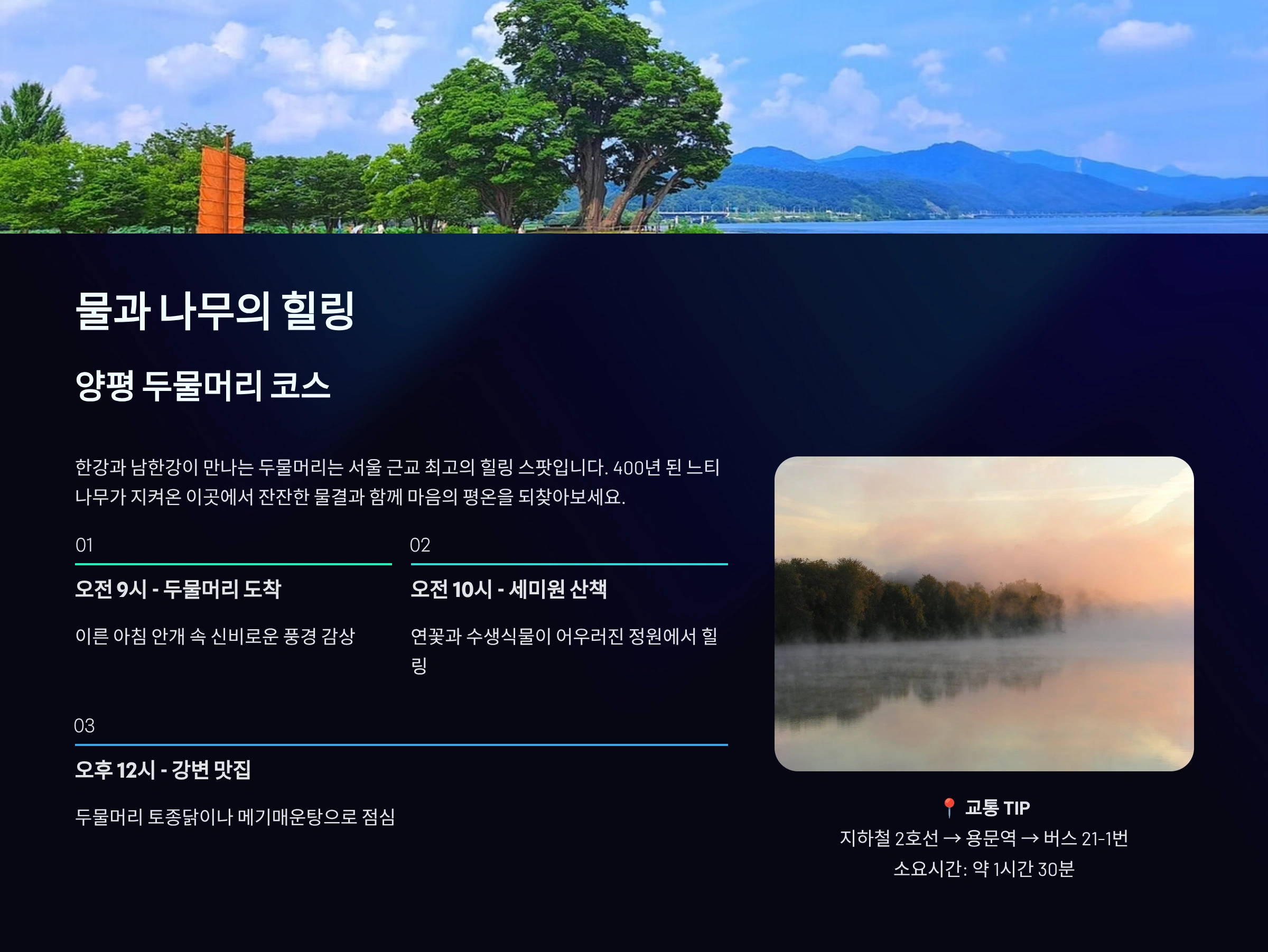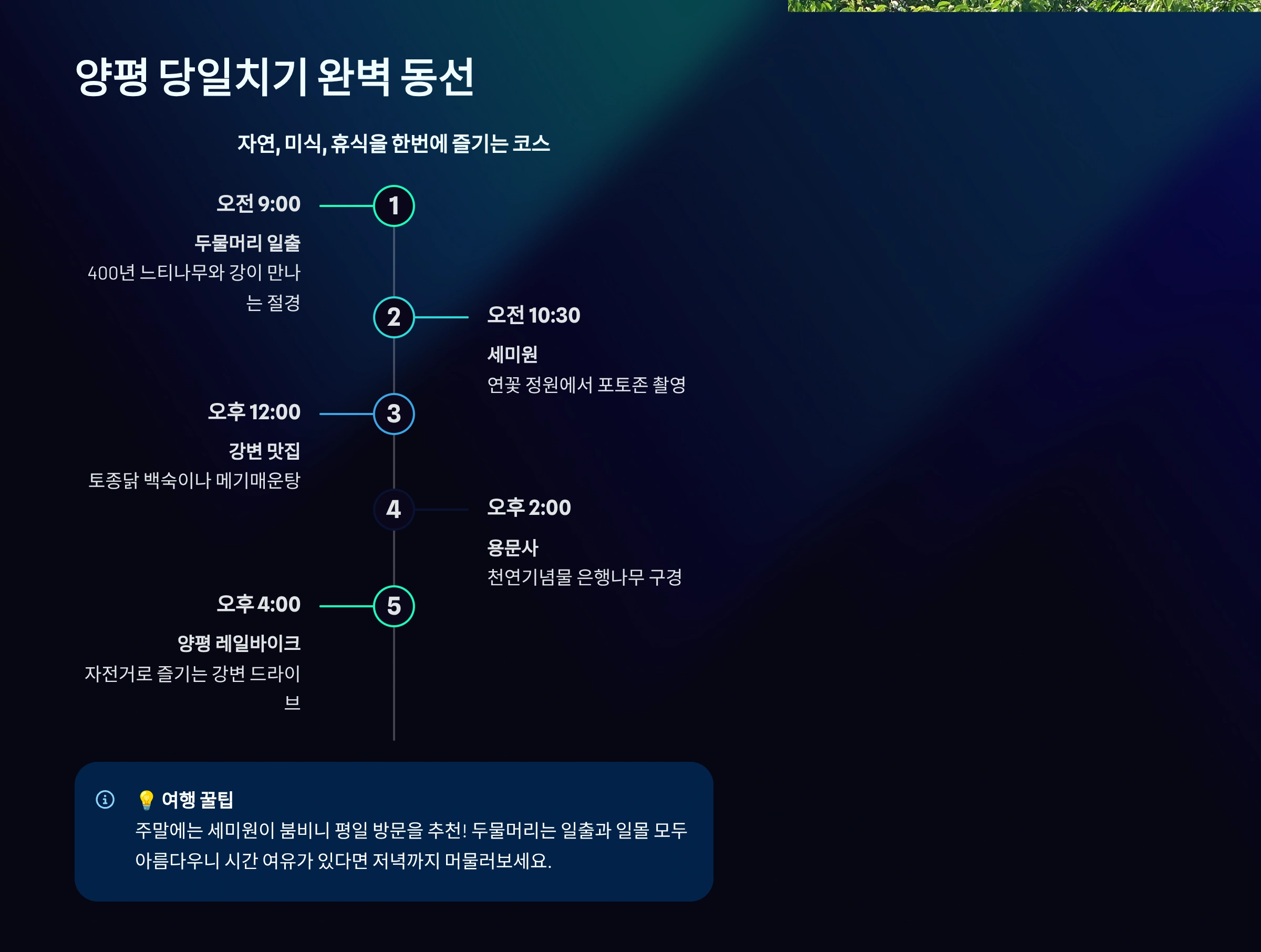 양평 코스의 핵심은 '여유'입니다. 빡빡한 일정보다는 아름다운 자연을 배경으로 느긋하게 산책하고, 맛있는 음식을 먹고, 전망 좋은 카페에서 '물멍'을 즐기는 힐링에 초점을 맞추는 것이 좋습니다. 경의중앙선을 이용하면 뚜벅이 여행자도 쉽게 다녀올 수 있다는 장점이 있습니다.