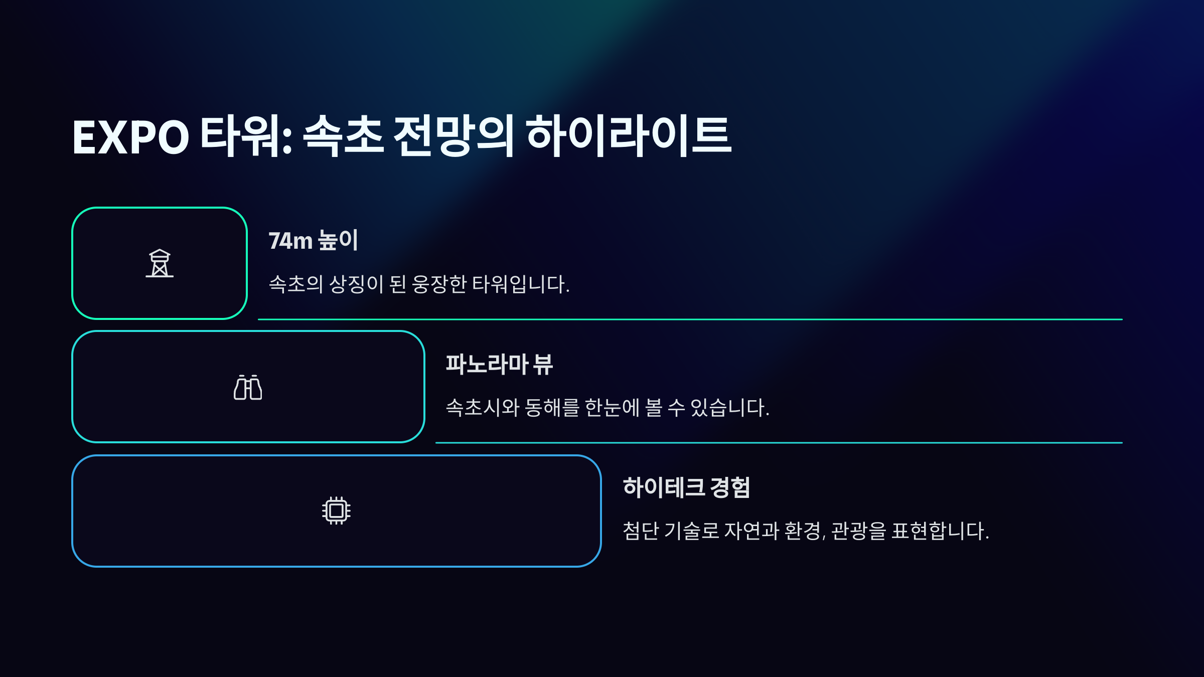 타워 전망대에 오르면 동쪽으로는 청초호와 동해가, 서쪽으로는 설악산이 병풍처럼 펼쳐져요. 이곳에서 바라보는 해질녘의 황금빛 도시는 정말 감탄이 절로 나오는 풍경이에요.