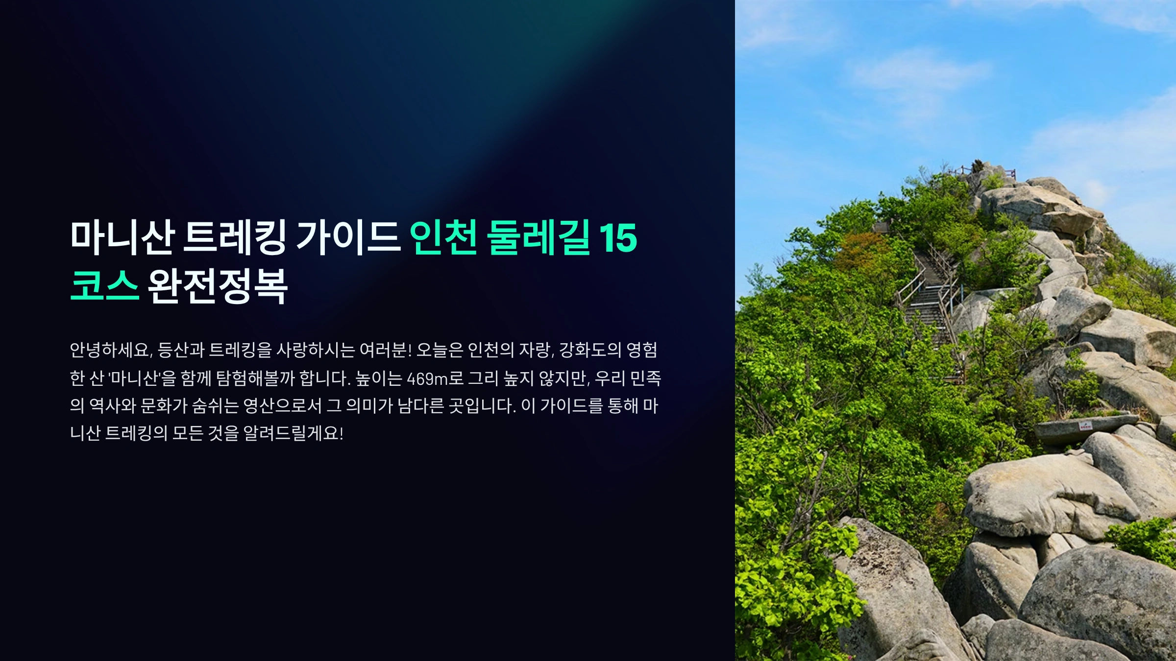 인천의 둘레길 중에서도 압도적인 풍경과 웅장함을 자랑하는 15코스는 바로 강화도 마니산에 위치해 있습니다. 민족의 영산으로 불리는 마니산은 단순히 걷는 길을 넘어, 단군 신화와 역사의 흔적을 따라 걷는 특별한 경험을 선사합니다.