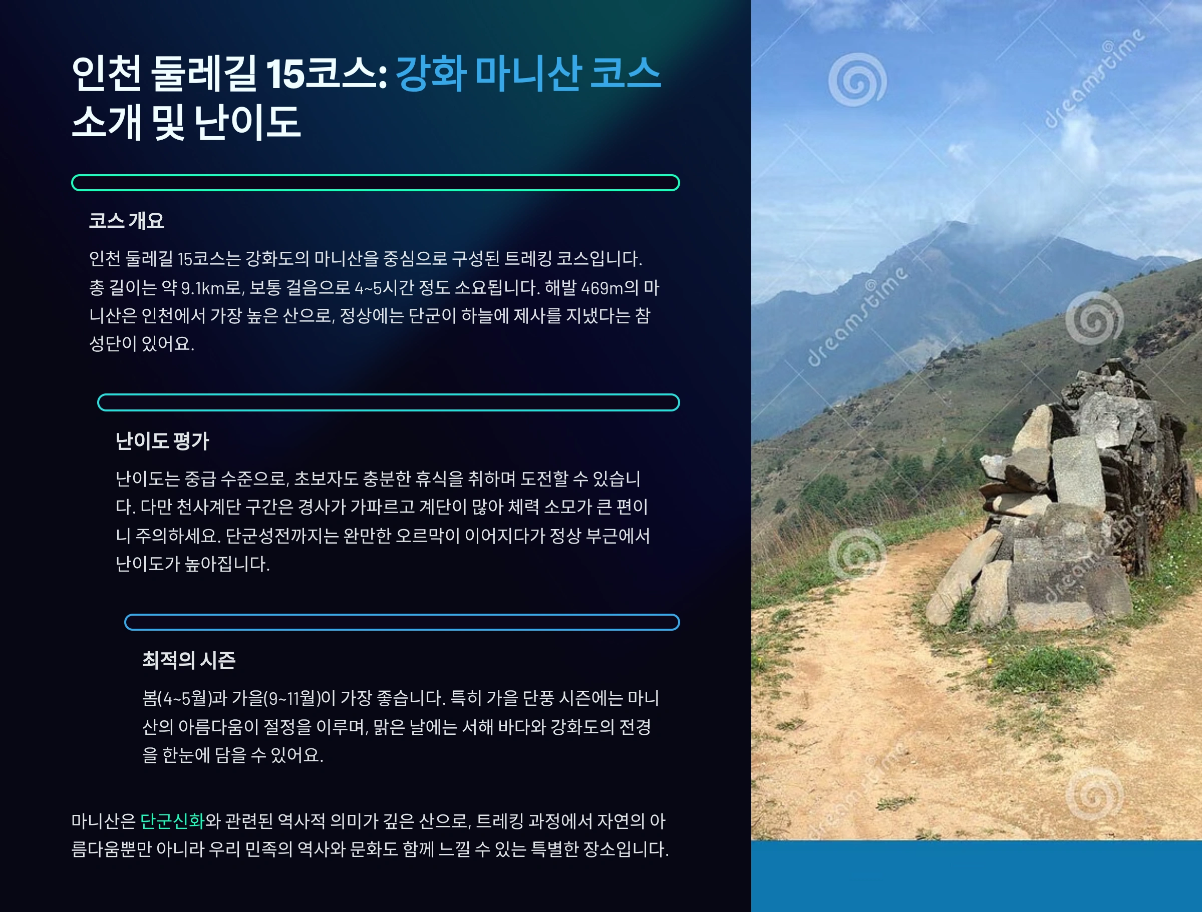 인천 둘레길의 15코스는 강화도에 위치한 마니산을 중심으로 하는 코스로, 총 거리 약 5.2km이며 소요 시간은 약 3시간으로 알려져 있습니다. 다른 둘레길 코스에 비해 난이도가 '어려움'으로 분류될 만큼 경사가 가파르고 계단이 많아 충분한 체력을 요합니다. 마니산은 해발 472.1m로 강화도와 인천에서 가장 높은 산이며, 정상에 오르면 서해의 아름다운 풍경과 함께 강화도의 모습을 한눈에 담을 수 있습니다.