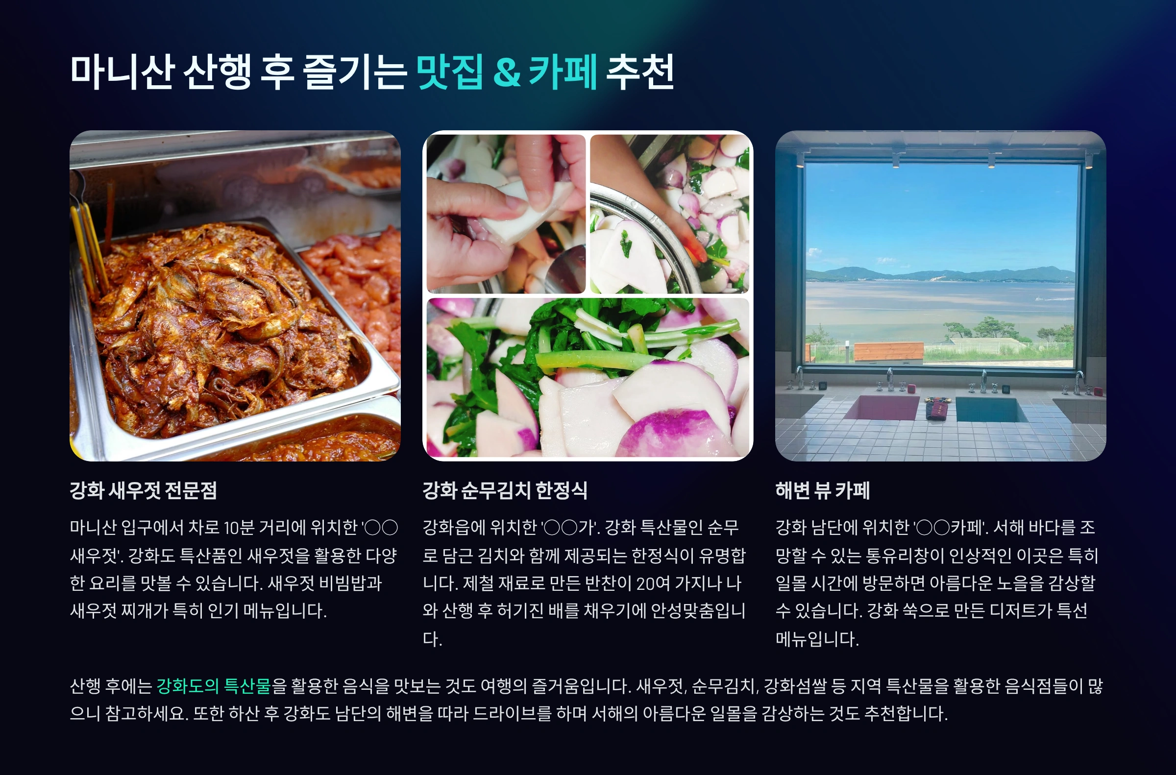 - 해산물 맛집: 마니산과 가까운 동막해수욕장이나 전등사 방면에 싱싱한 해산물 요리 전문점들이 많습니다.