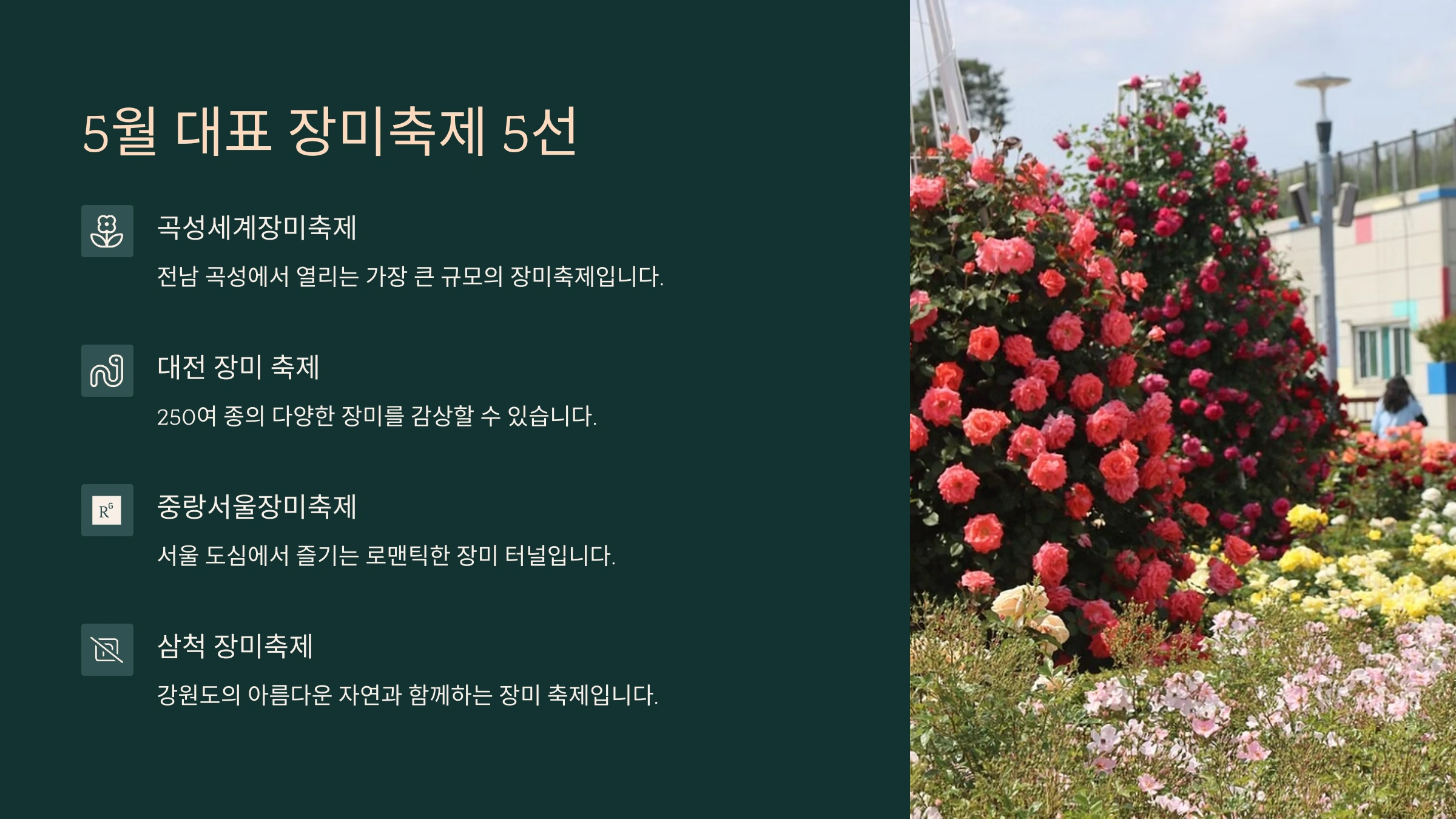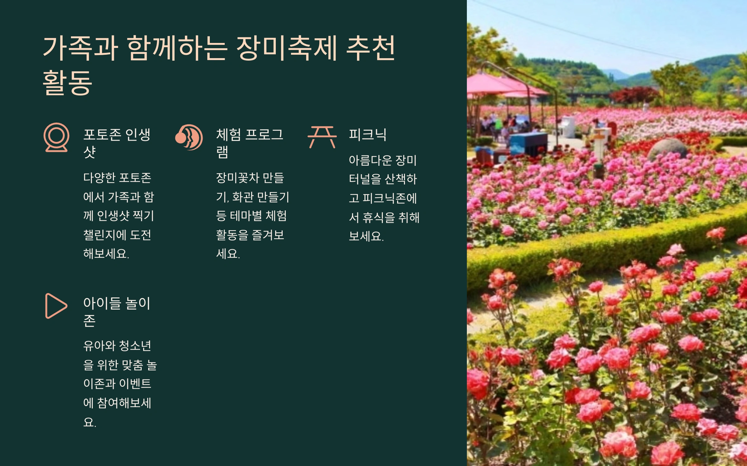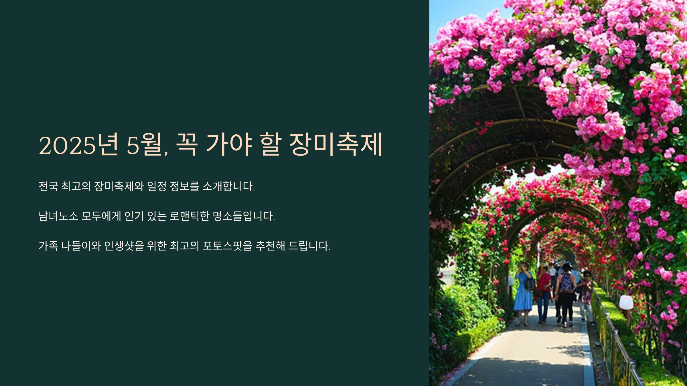 2025년 장미축제 하는곳을 알아보았습니다. 각 지역의 특색 있는 장미축제는 저마다의 매력이 있으니, 가족의 취향과 여행 계획에 맞게 선택하시기 바랍니다. 장미의 향기로운 세계로 떠나는 여행은 5월의 가장 아름다운 추억이 될 것입니다. 미리 일정을 확인하고 준비하여 놓치지 마세요!