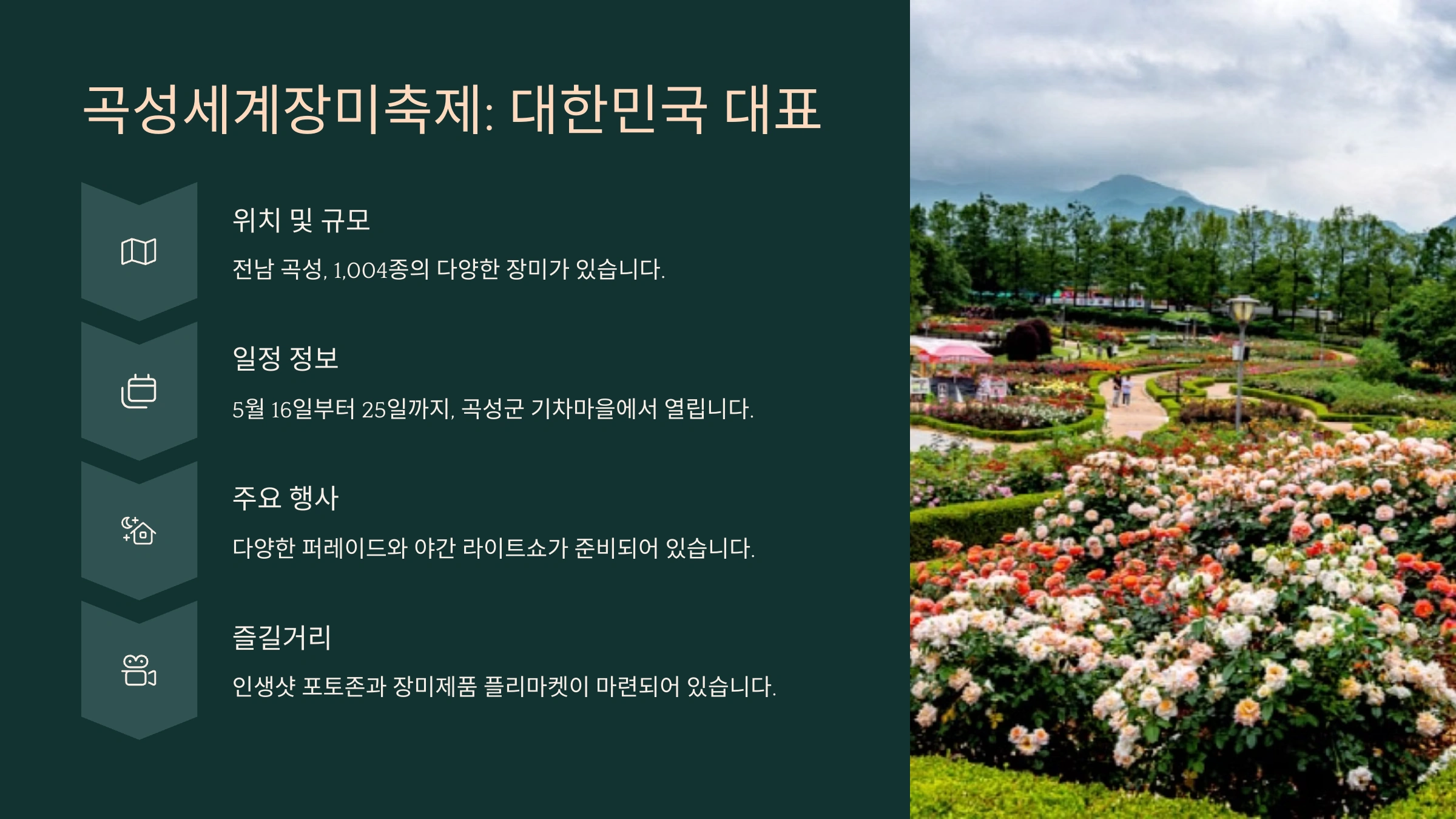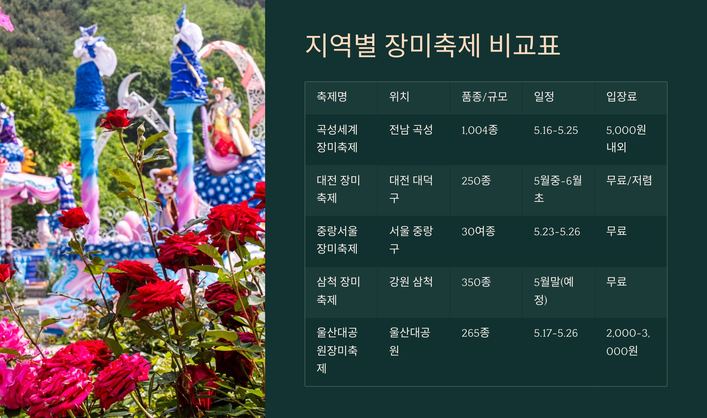 | 곡성세계장미축제 | 전남 곡성 | 5.16~5.25 | 5,000원 | 1,004종 | 야간 불꽃쇼, 로즈마켓 |