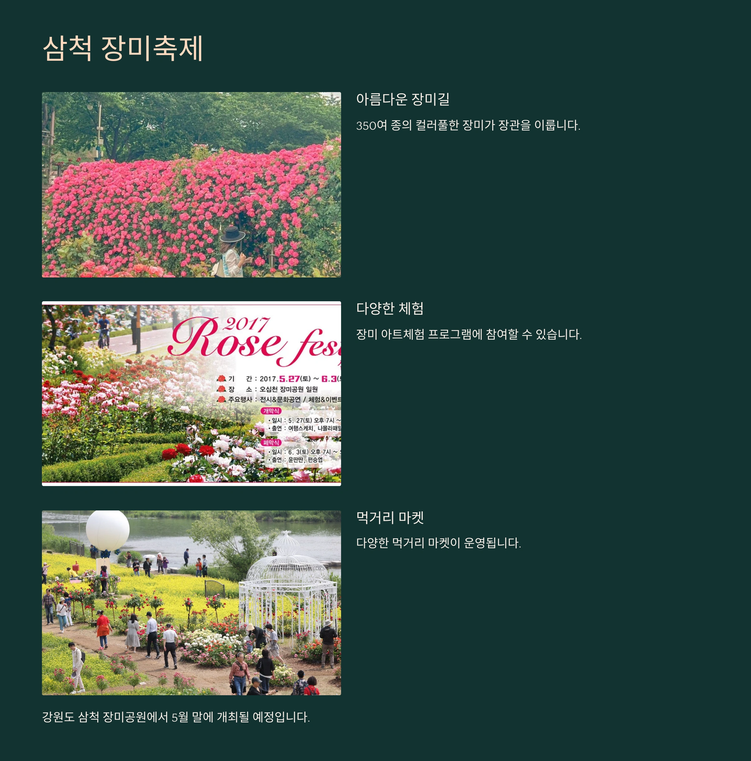 | 삼척장미축제 | 강원 삼척 | 5월 하순 | 무료 | 50여 종 | 바다와 장미의 조화 |