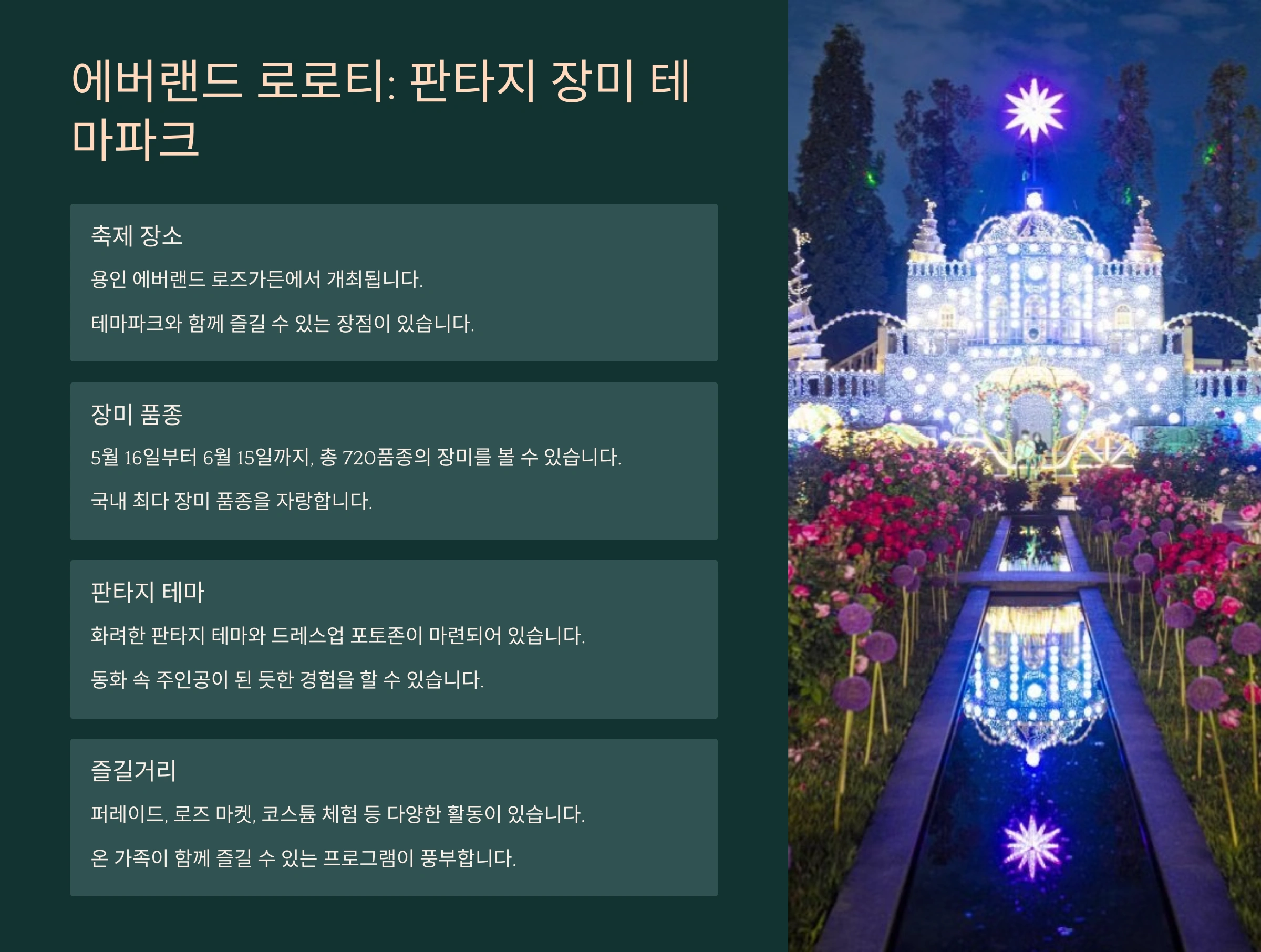 경기도 용인시 에버랜드에서는 2025년 5월 16일부터 에버랜드 로로티 행사가 시작됩니다. 720종의 다양한 장미와 300만 송이의 꽃이 조성된 판타지 테마파크로, 국내 최대 규모의 테마파크에서 즐기는 장미축제입니다.