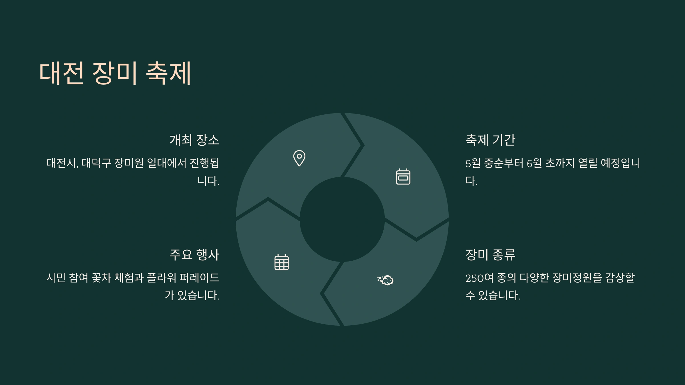 | 대전 장미 축제 | 대전 서구 | 5월 중순 | 무료 | 100여 종 | 도심 속 장미원, 문화 행사 |