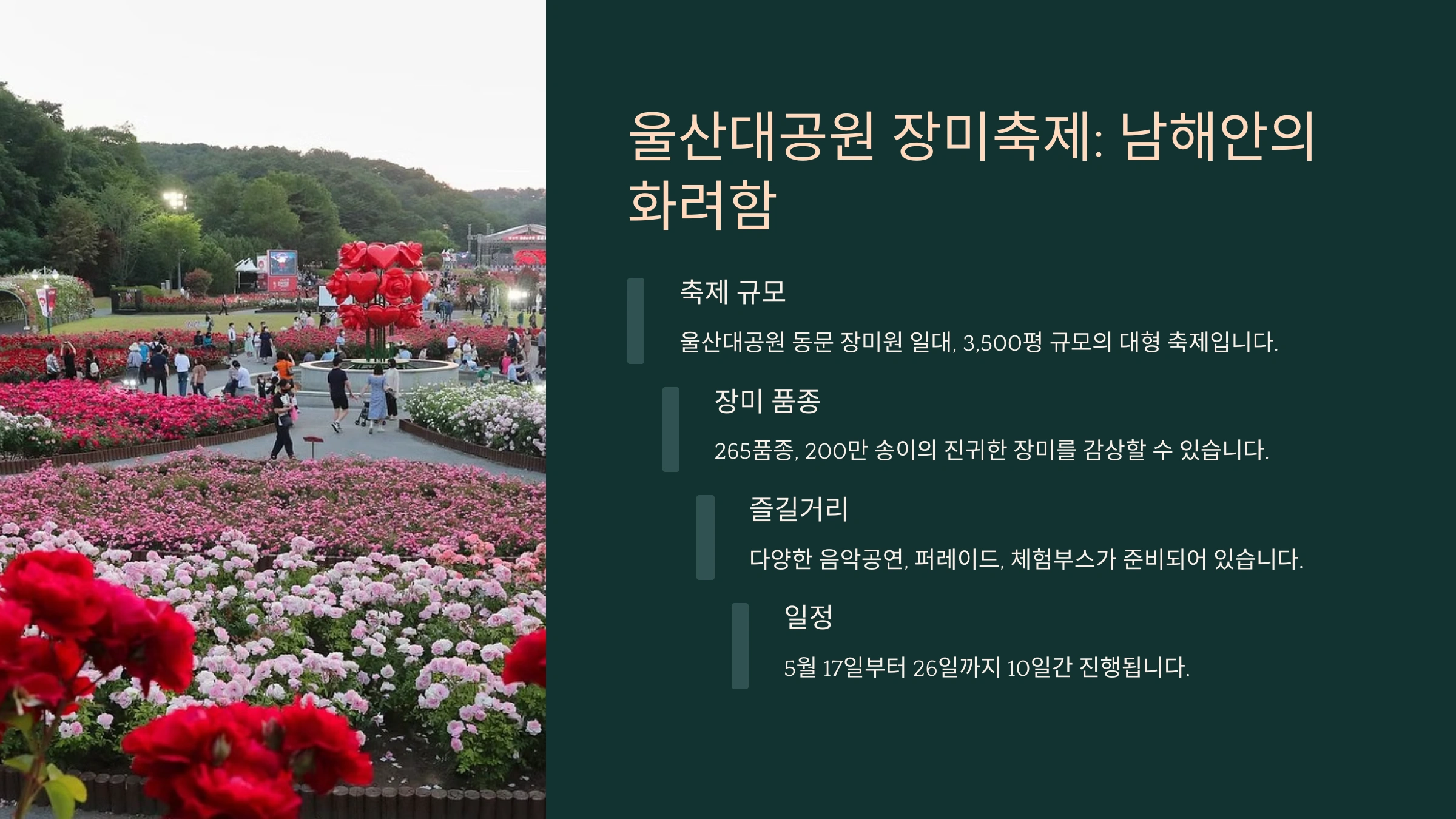 | 울산대공원 장미축제 | 울산 남구 | 5.21~5.25 | 무료 | 300여 종 | 남해안 분위기, 체험 프로그램 |