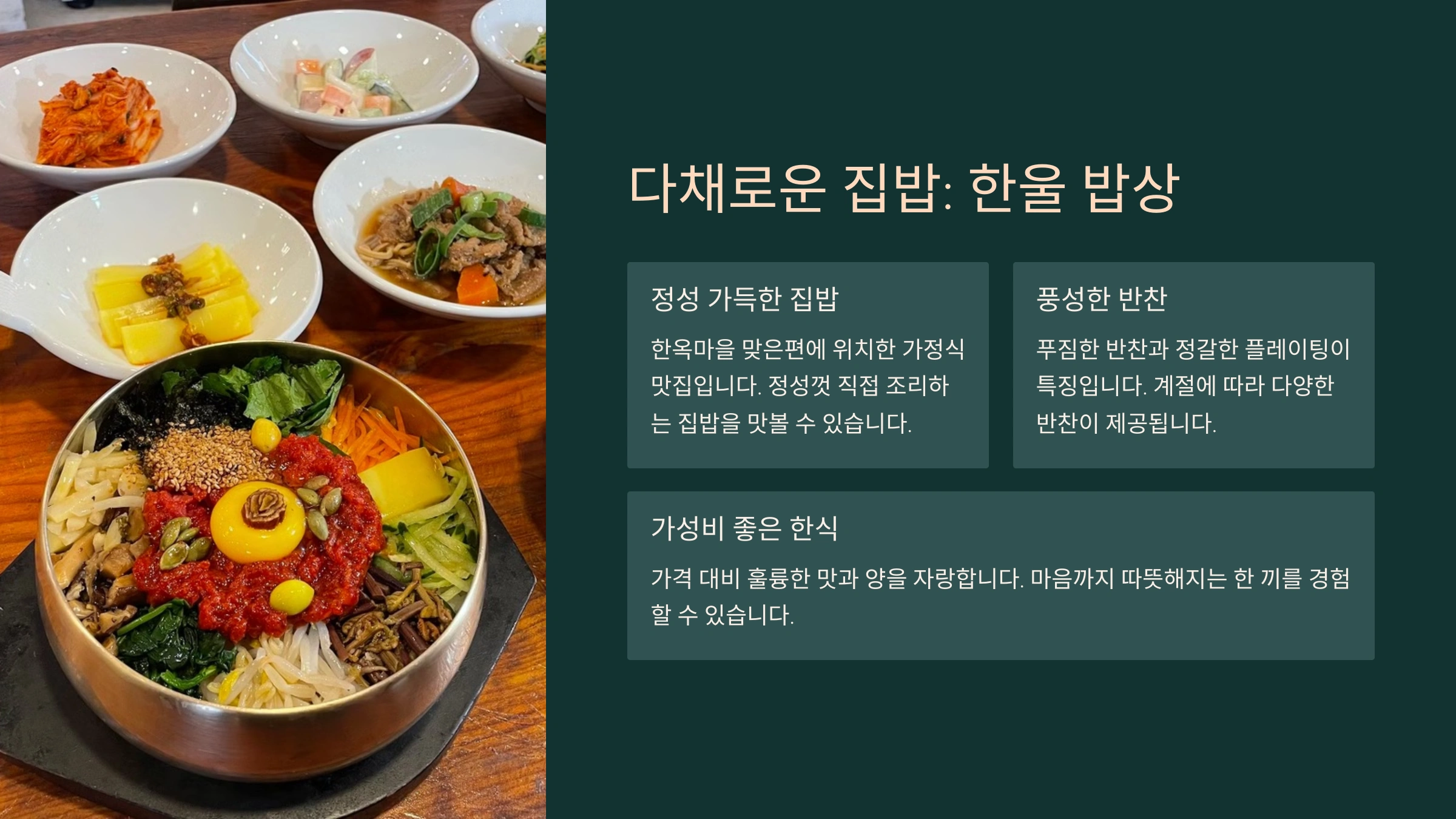 한울 밥상의 메뉴는 전통 한식을 기본으로 하되, 현대적인 감각을 더해 남녀노소 누구나 부담 없이 즐길 수 있도록 구성되어 있습니다. 전주한옥마을 여행의 시작이나 마무리를 위한 식사 장소로 적합합니다.