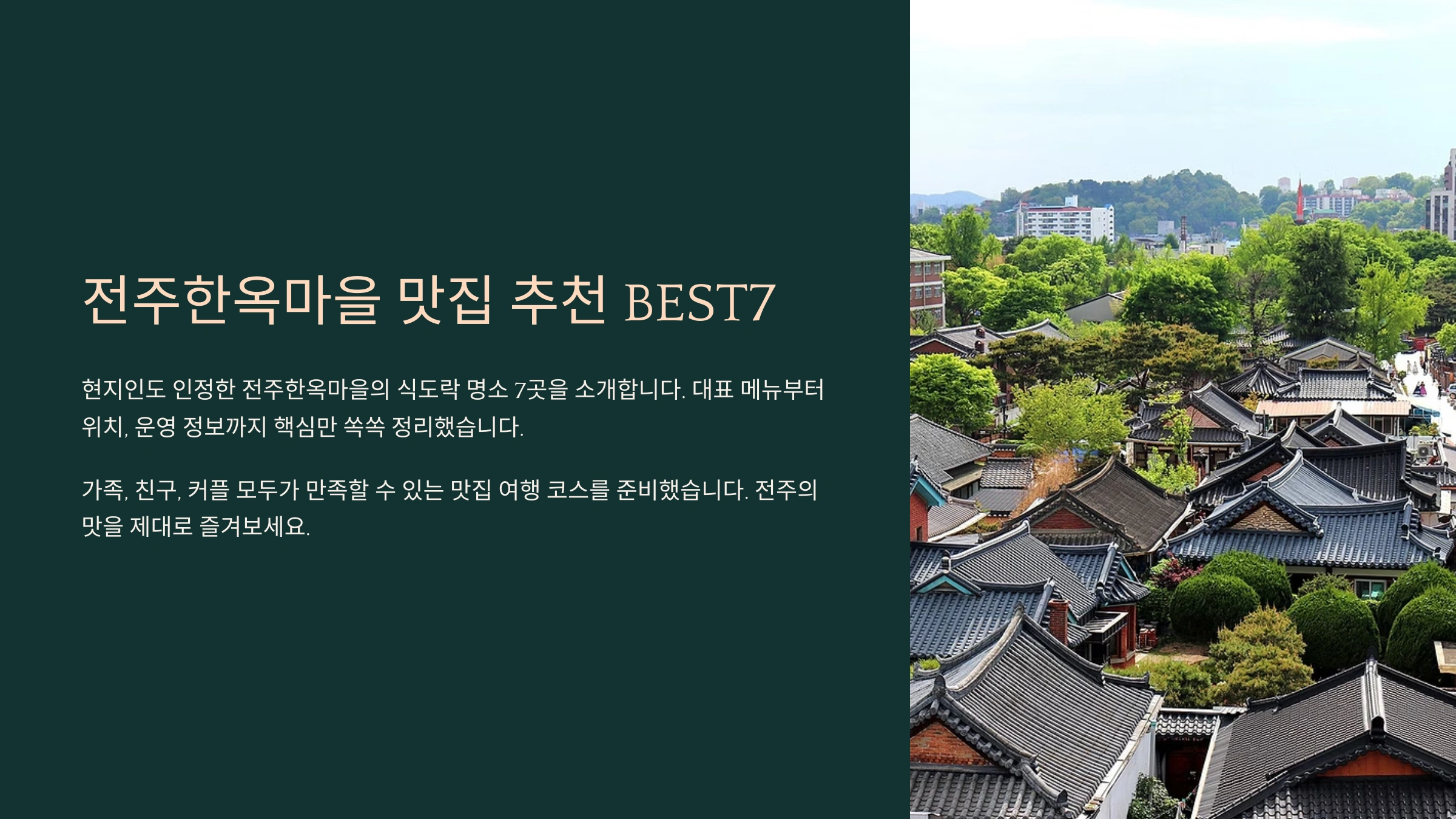 전주한옥마을을 찾을 때 빼놓을 수 없는 것이 바로 맛집 탐방입니다. 역사적 풍경을 감상하며 즐기는 전통 음식의 매력은 더욱 특별합니다. 이번 글에서는 전주한옥마을에서 꼭 가봐야 할 7곳의 맛집을 소개해 드립니다. 여행 계획 세우실 때 참고하시면 후회 없는 미식 여행이 될 것입니다.