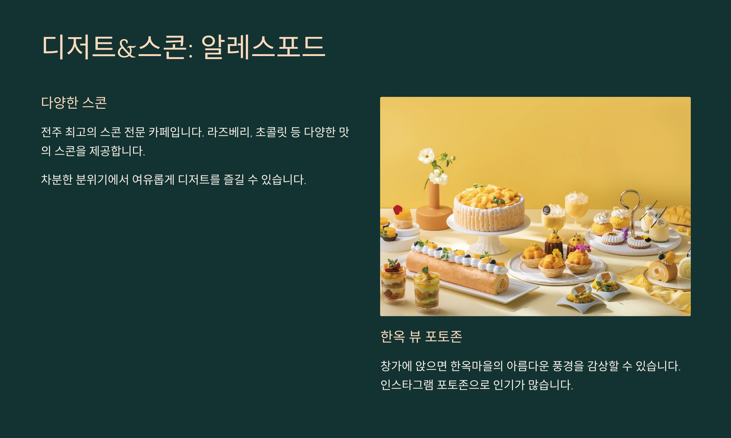 한옥마을에서의 관광에 지쳐 달콤한 휴식이 필요하다면 알레스포드는 최고의 선택입니다. 이 카페는 다양한 종류의 스콘과 커피를 제공하며, 전통 한옥과 조화를 이루는 인테리어가 특별한 분위기를 자아냅니다.