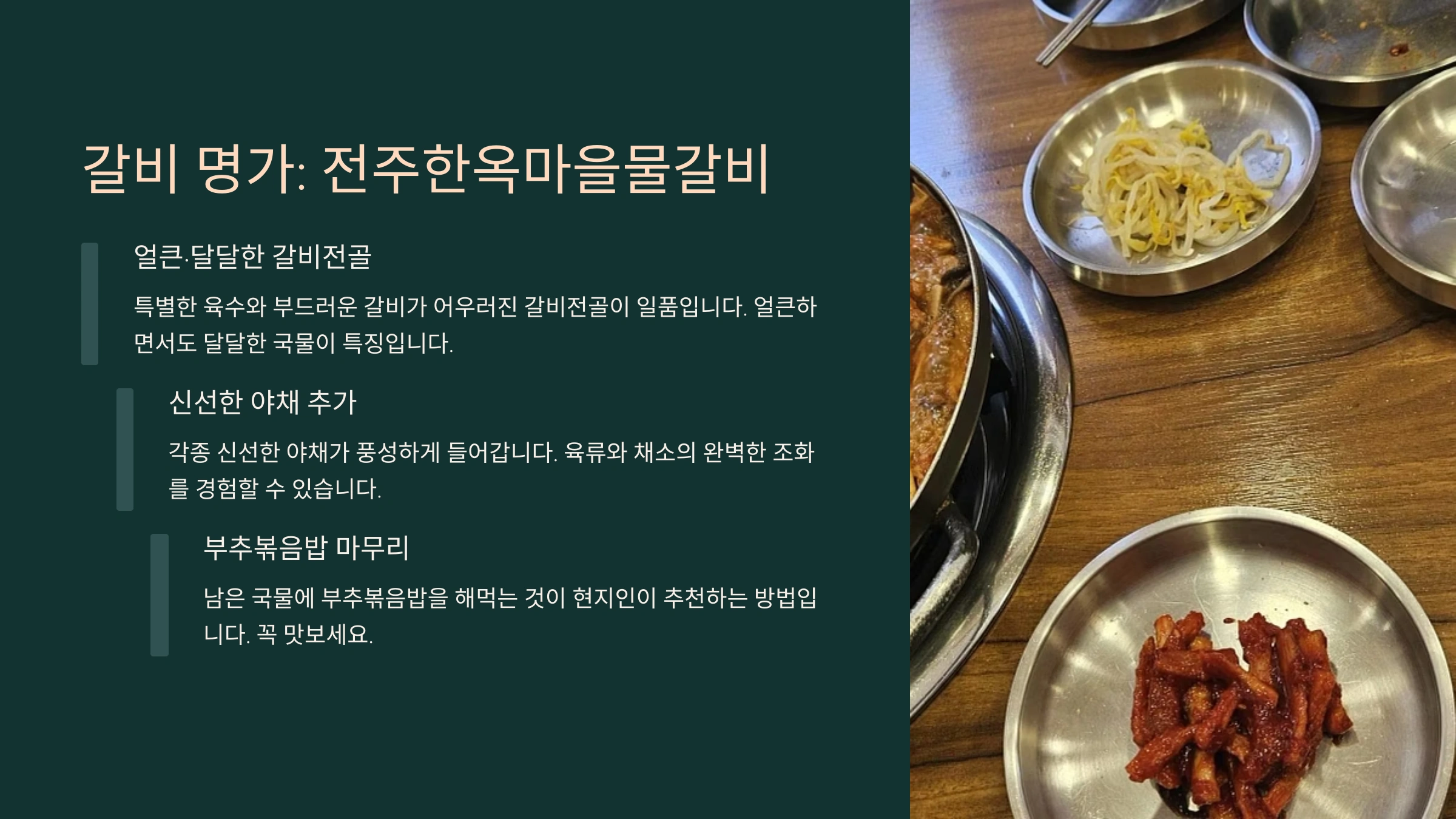 전주의 맛을 다양하게 경험하고 싶은 여행객들에게 갈비 맛집 방문은 또 다른 미식 경험이 될 것입니다. 한옥마을의 전통적인 분위기 속에서 즐기는 물갈비는 특별한 기억으로 남을 것입니다.