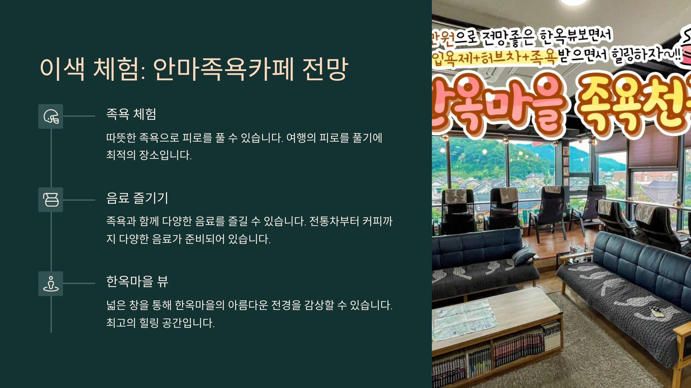 전주 한옥마을을 둘러보며 지친 발과 어깨의 피로를 풀고 싶으시다면, 안마족욕카페 전망에서 특별한 힐링 시간을 가져보시길 추천드립니다.