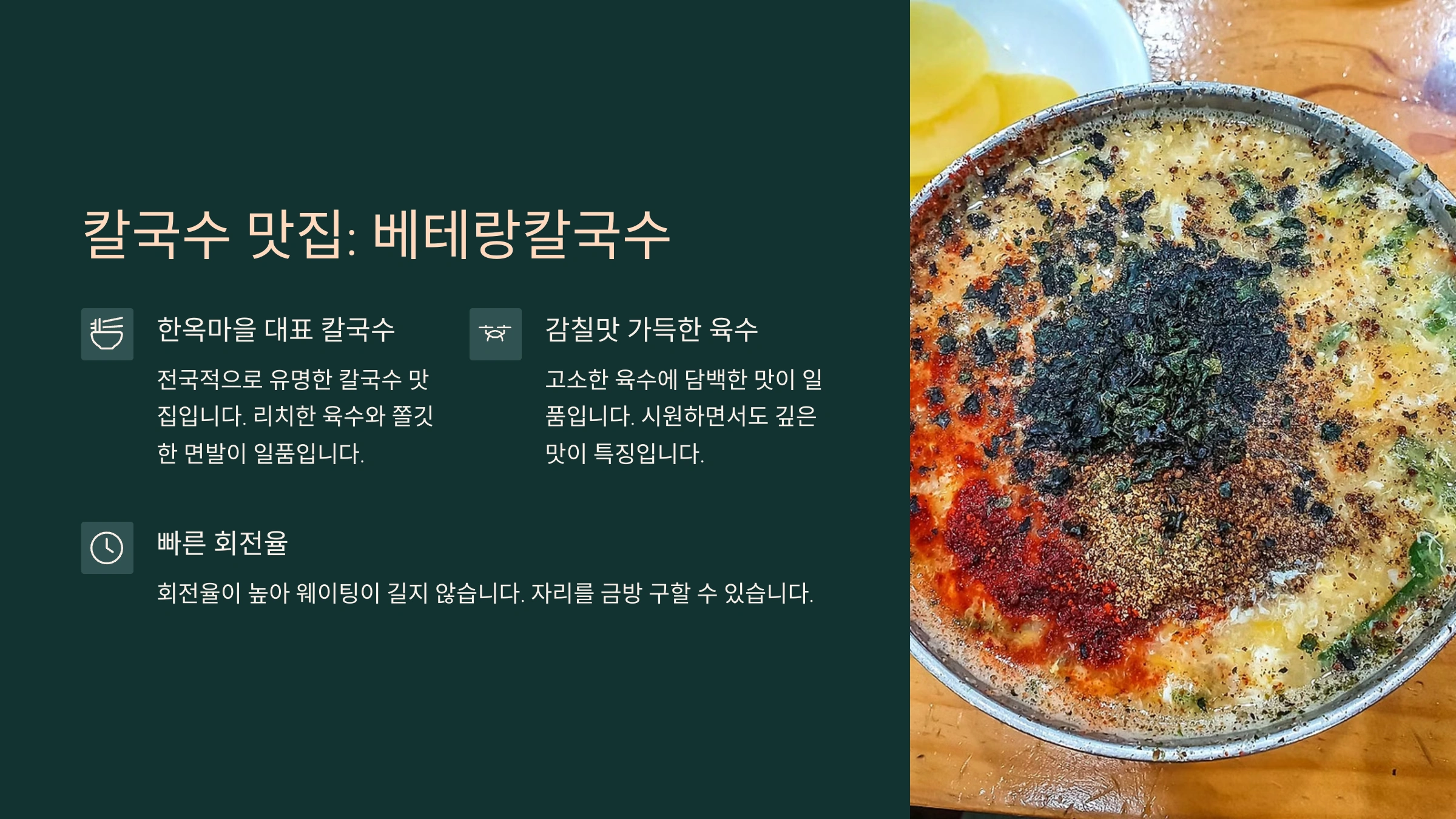 전주한옥마을에서 가장 인기 있는 맛집으로 손꼽히는 베테랑칼국수는 전국적으로 명성이 자자합니다. 경기전길 135에 위치한 이곳은 항상 사람들로 북적이지만, 회전률이 빨라 오래 기다리지 않고 맛있는 한 끼를 즐길 수 있습니다.