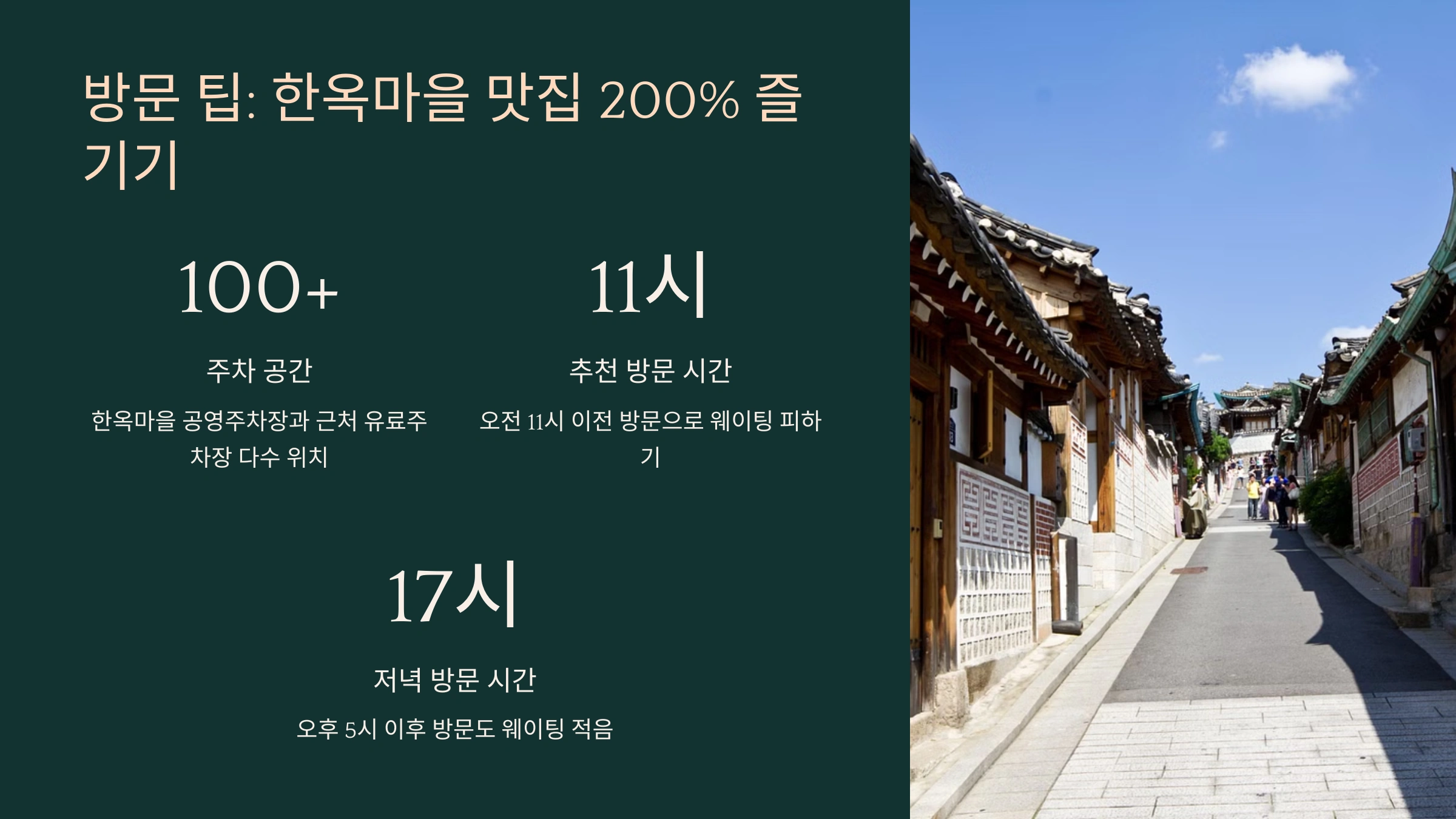 혼잡을 피해 여유롭게 전주한옥마을 맛집을 즐기고 싶다면 평일 오전이나 오후 늦은 시간대 방문을 추천합니다. 주말에는 특히 11시부터 2시 사이가 가장 붐비는 시간대이므로, 이 시간을 피해 식사 계획을 세우는 것이 현명합니다.