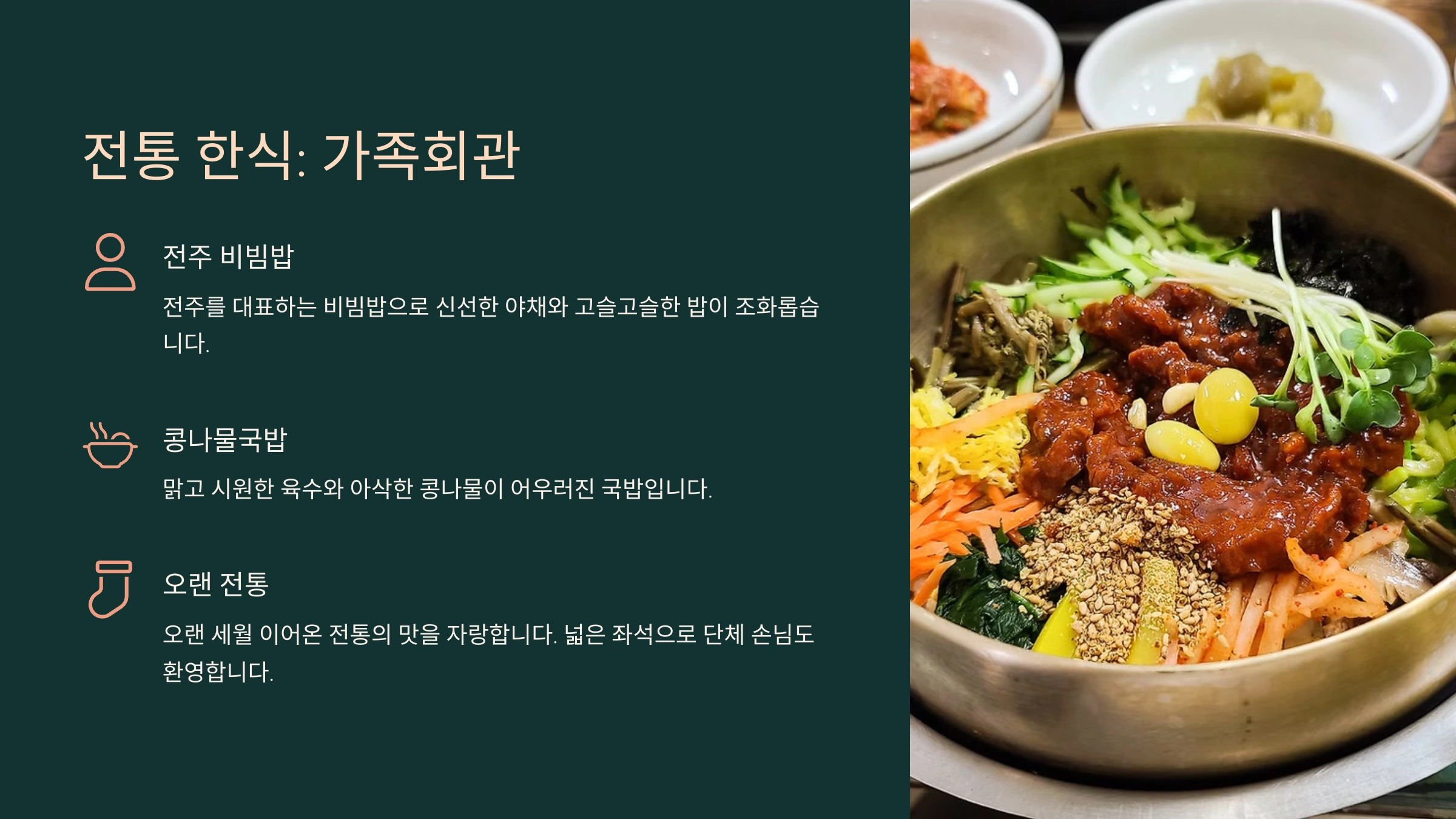 전주 한옥마을 인근에 위치한 가족회관은 1979년 개업 이후 3대째 전통을 이어오고 있는 전주비빔밥 전문점입니다. 전주음식명인 1호로 지정된 김년임 명인이 창립한 이곳은 대한민국 식품명인 39호로도 선정되었으며, 중소벤처기업부 인증 '백년가게'로도 알려져 있습니다.
