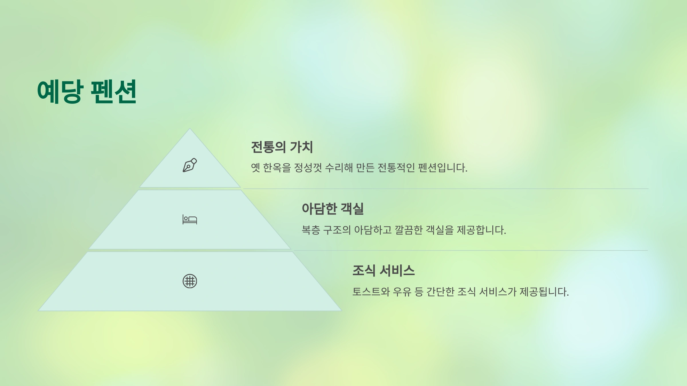 전주 한옥마을 숙박 중에서도 전통의 가치를 중시하면서도 실용적인 측면을 놓치지 않는 여행자라면 예당 펜션이 좋은 선택이 될 것입니다.