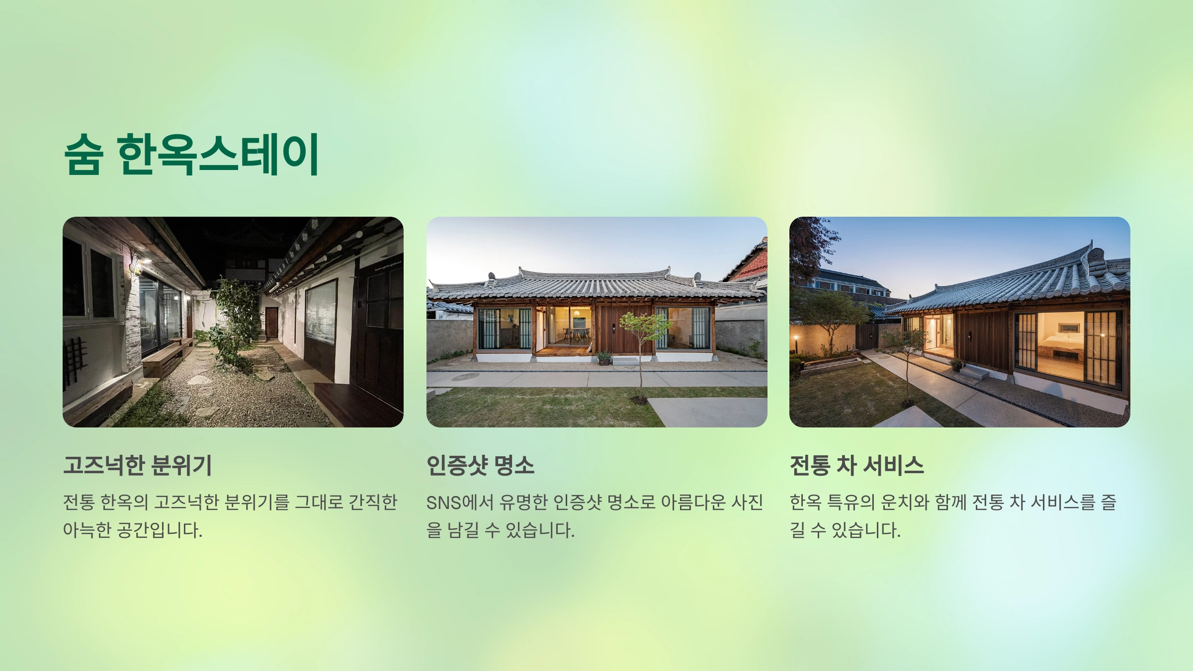 - 전통 한옥의 아름다움: 기와, 나무, 황토, 흙, 한지 등이 어우러진 전통 한옥 구조로, 고즈넉한 분위기를 제공합니다.