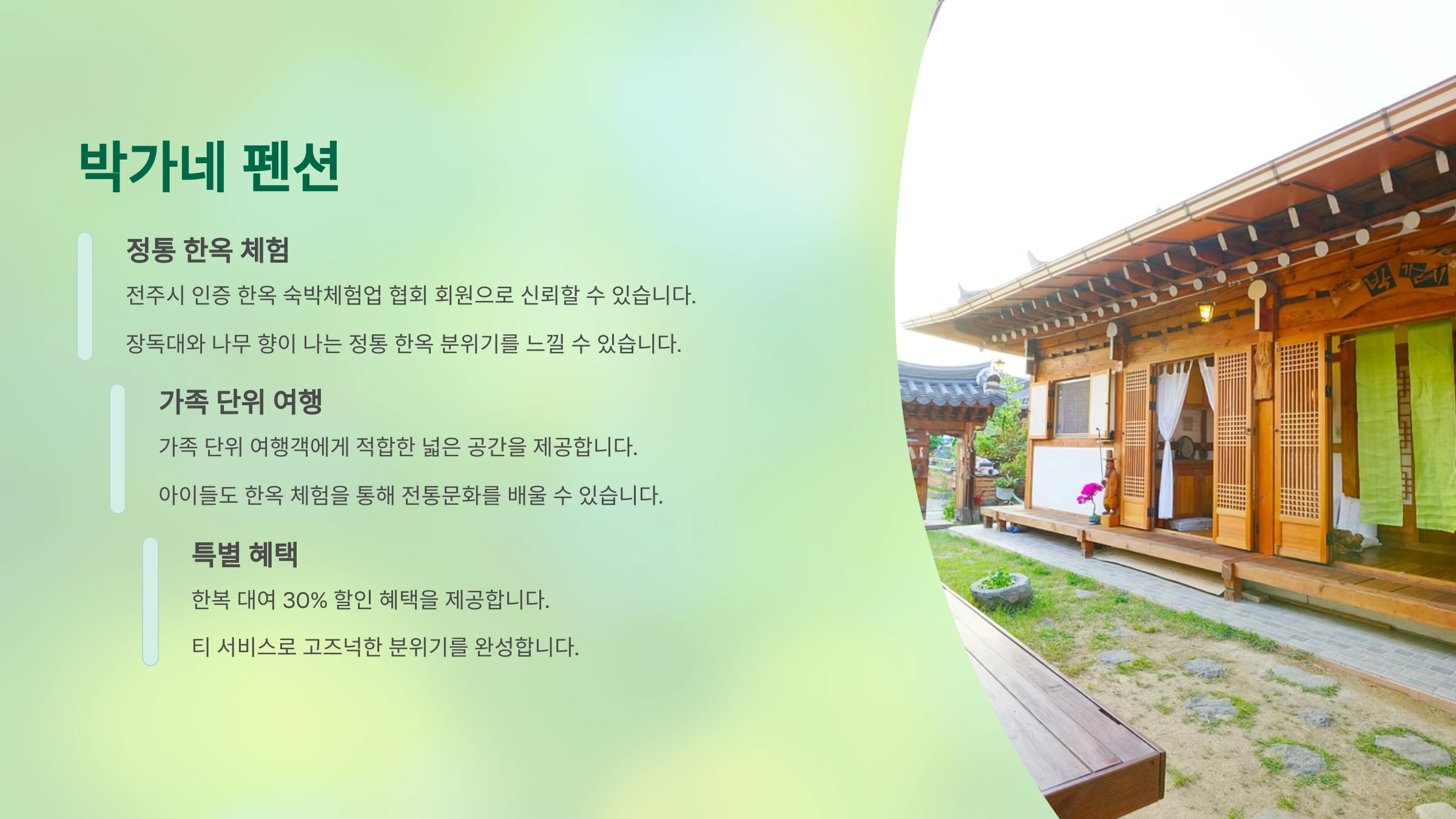 전주 한옥마을 숙박 시설 중에서도 가족의 편안함과 즐거움을 최우선으로 고려하는 여행자라면 박가네 펜션이 이상적인 선택이 될 것입니다.