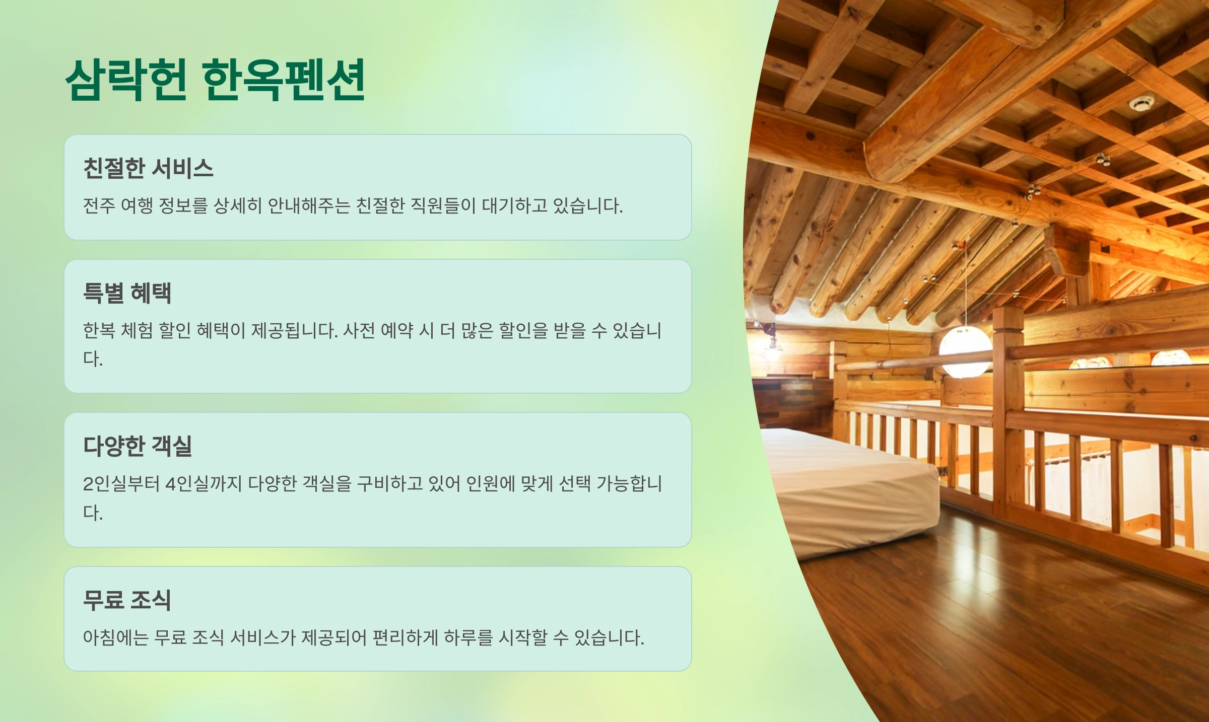 - 주차: 전주한옥마을 공영주차장 이용 시, 숙박 영수증 제시로 50% 할인 혜택을 받을 수 있습니다.