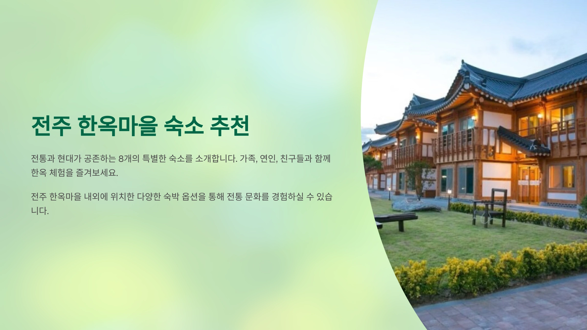 전통과 현대가 공존하는 전주 한옥마을에서의 하룻밤은 어떨까요? 한옥의 정취를 느끼며 보내는 시간은 여행의 품격을 한층 높여줍니다. 전주 한옥마을 숙박을 고민 중이시라면, 다양한 스타일과 가격대의 숙소들을 소개해 드립니다. 전통의 멋과 현대적 편의시설을 갖춘 최적의 숙소를 찾아보세요.