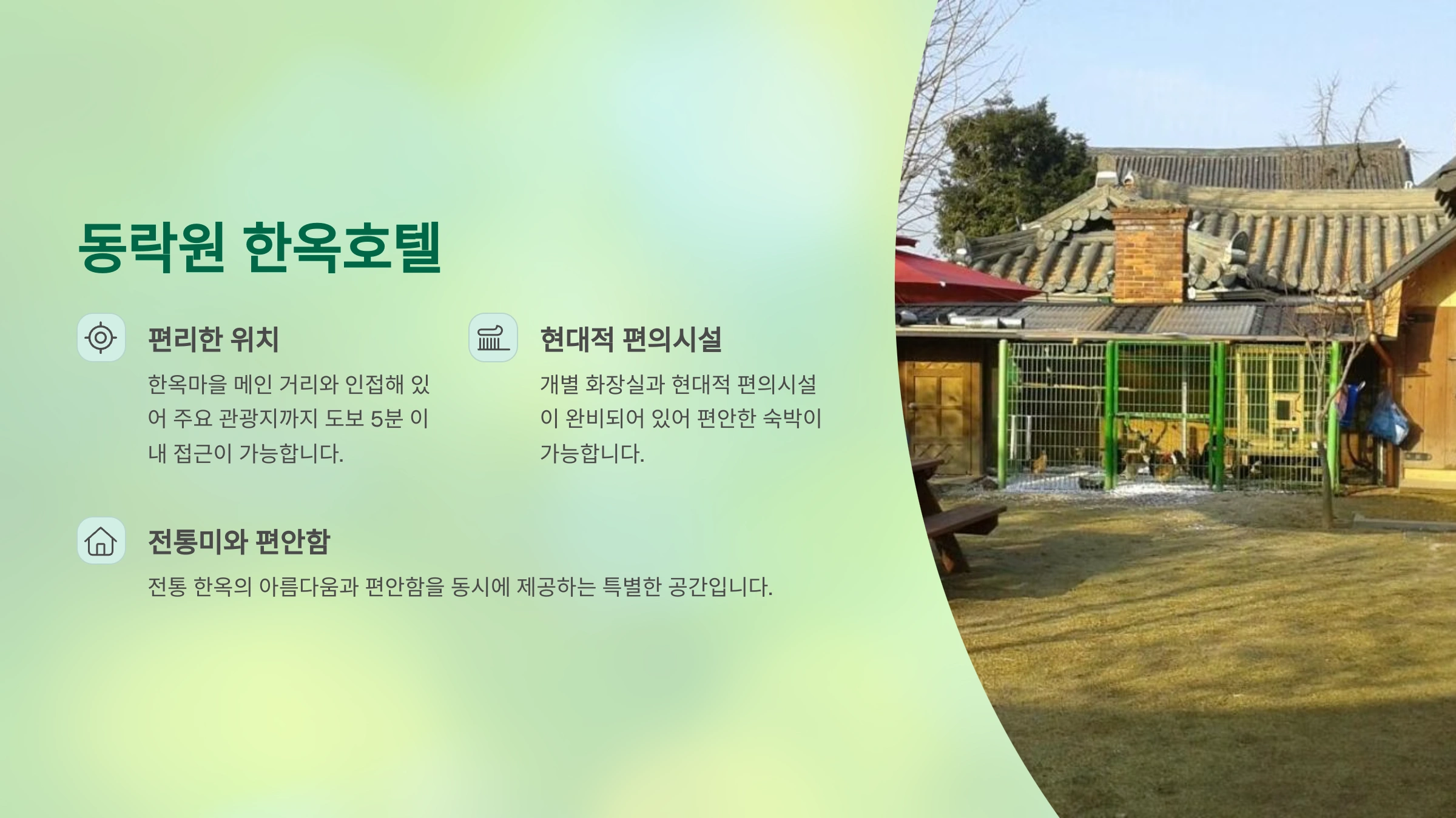 관광과 휴식을 모두 중시하는 여행자라면 동락원 한옥호텔이 균형 잡힌 선택이 될 수 있습니다.