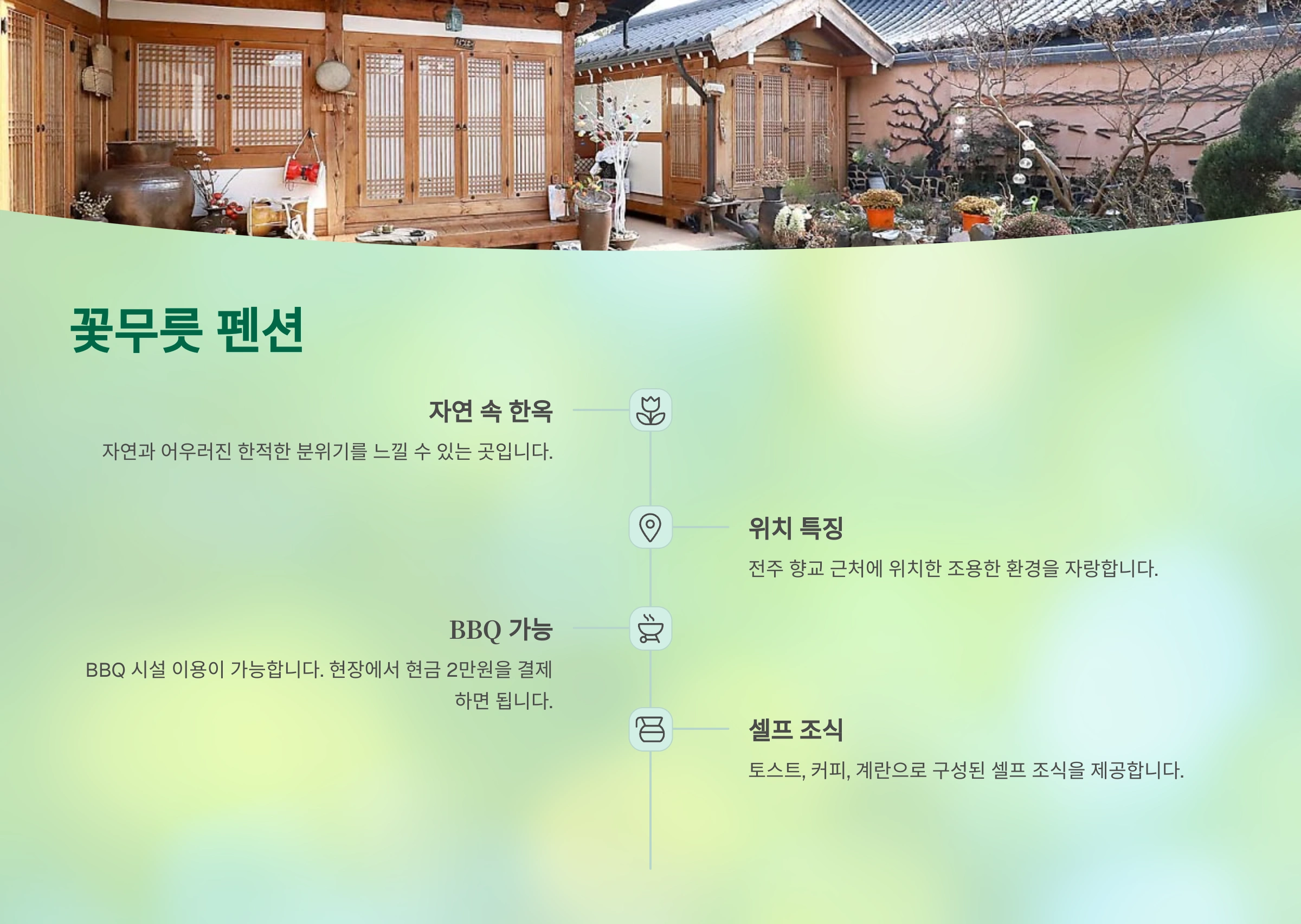 한옥마을 외곽에 위치한 꽃무릇 펜션은 자연 경관과의 조화를 강점으로 내세우는 소규모 숙소입니다.