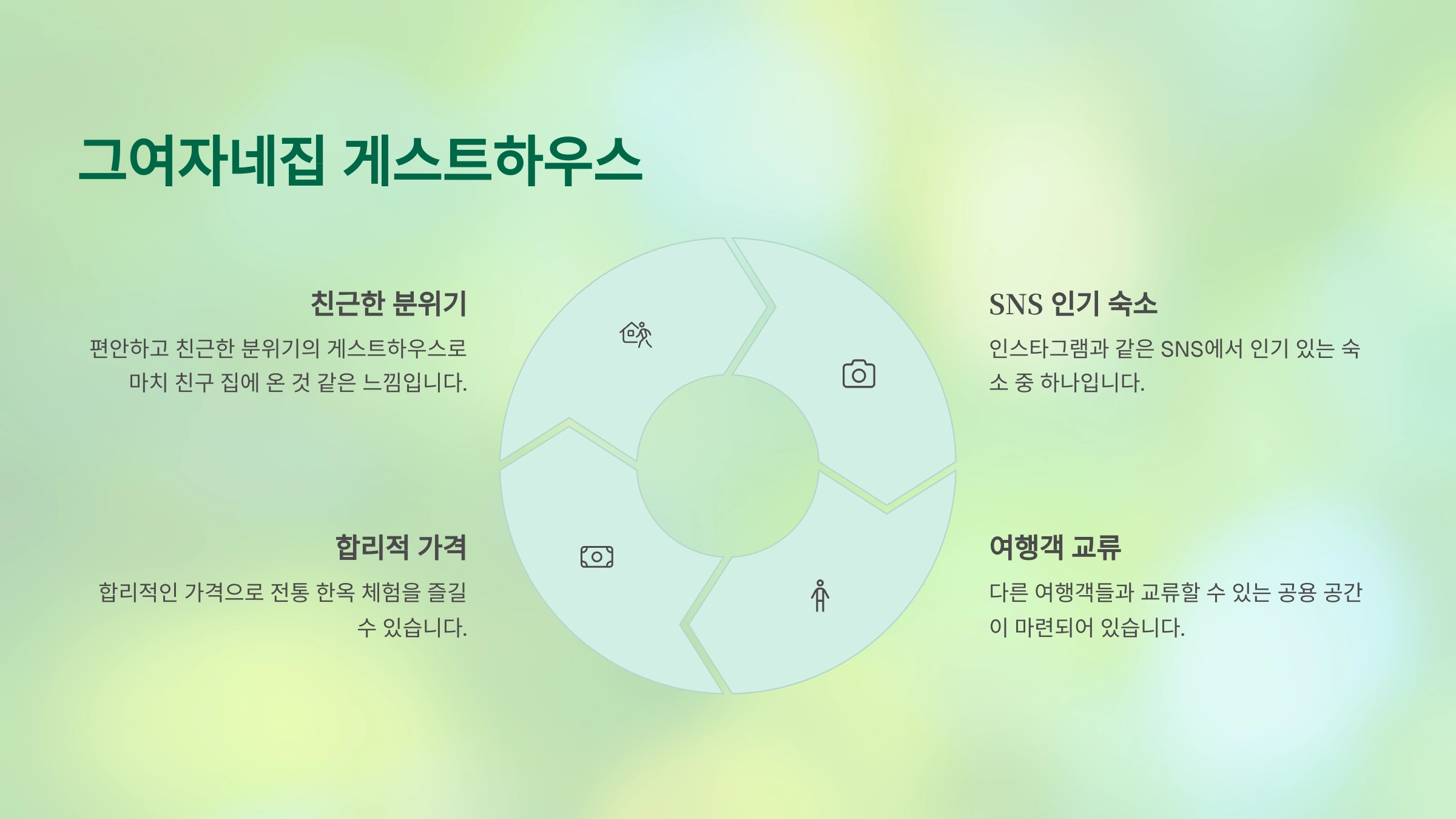 주변에 위치한 다양한 전통 공방과 문화유적지를 쉽게 탐방할 수 있는 입지 조건을 갖추고 있어 문화 체험을 중시하는 여행자에게 적합합니다. 중간 정도의 가격대로 운영되어 전통 한옥 체험을 원하지만 예산도 고려해야 하는 여행자들에게 균형 잡힌 선택지가 됩니다.