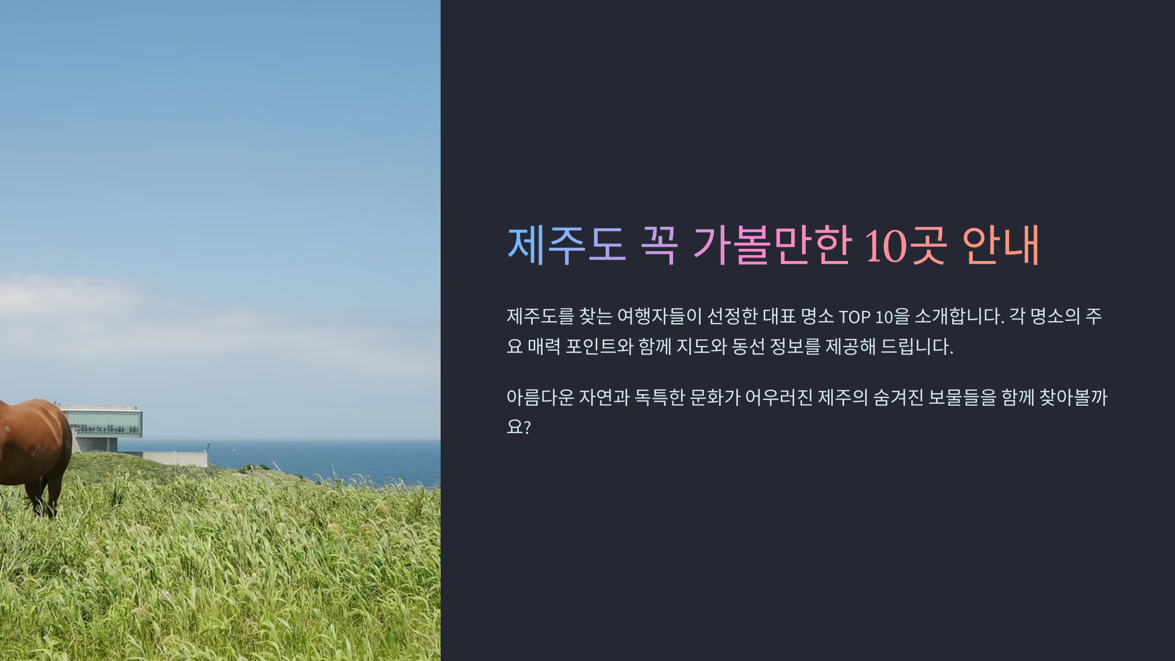 제주도여행을 계획 중이신가요? 아름다운 자연경관부터 이색 테마파크까지, 제주도가볼만한곳10곳을 소개해 드립니다. 섬 전체가 유네스코 세계자연유산으로 지정된 제주도는 계절마다 다른 매력을 선사합니다. 가족, 연인, 친구와 함께 잊지 못할 추억을 만들 수 있는 최고의 장소들을 지금 확인해보세요.