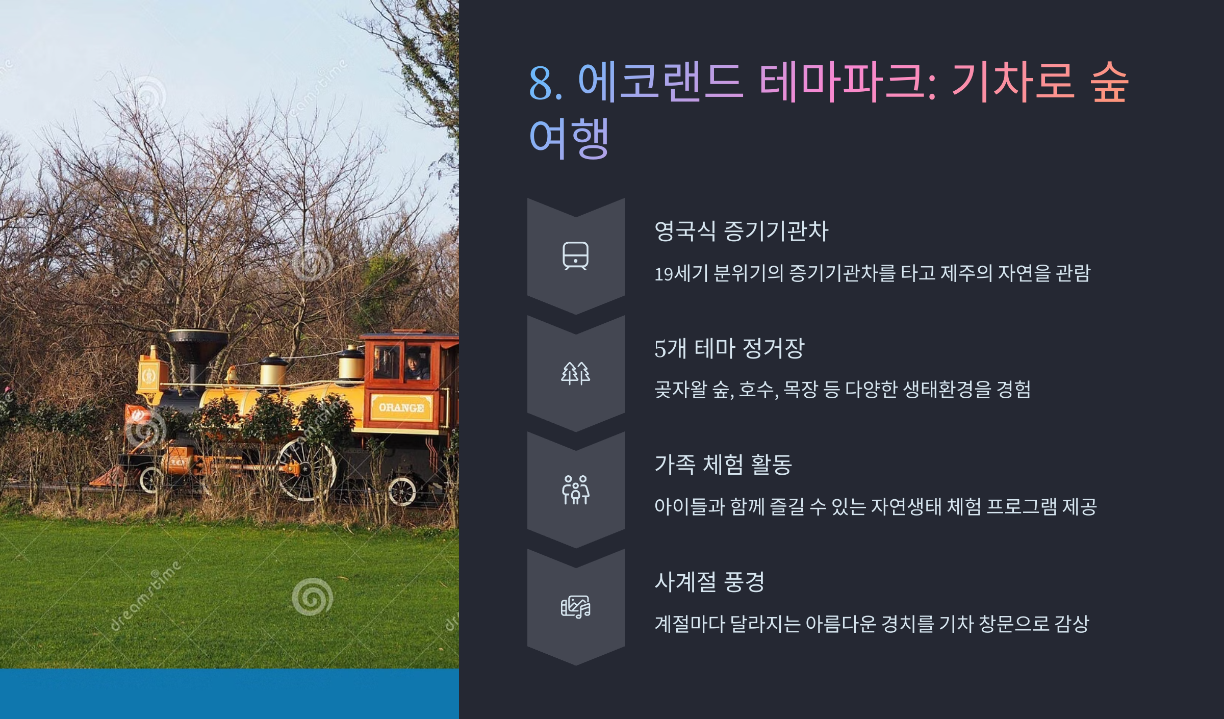 에코랜드 테마파크는 영국 빅토리아 시대 증기 기관차를 모티프로 만든 독특한 테마파크입니다. 총 15대의 목재 열차가 운행되며, 정규 좌석과 스카이라운지 형태로 구성되어 다양한 시점에서 제주도의 아름다운 자연을 감상할 수 있습니다.