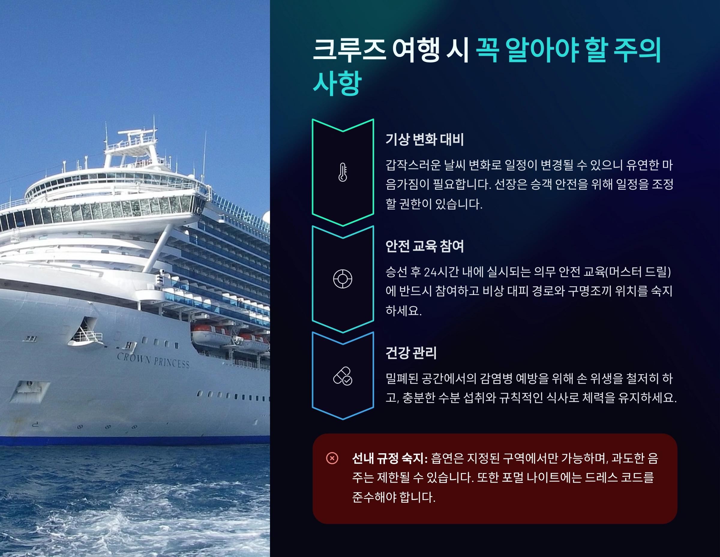 크루즈 여행은 정말 즐겁지만, 몇 가지 주의사항을 미리 알고 가면 더욱 완벽한 여행이 될 수 있어요.