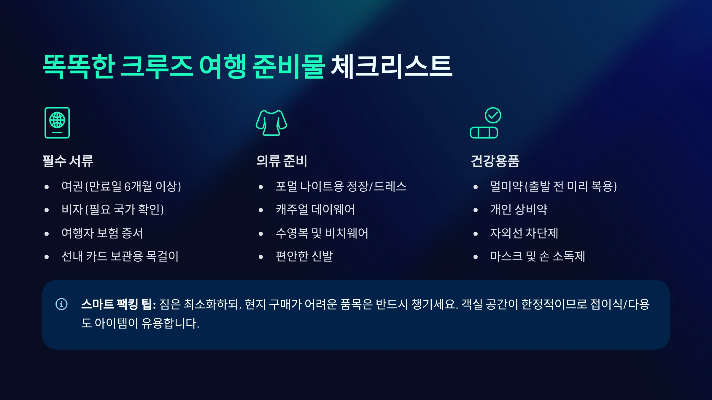 복잡하고 길었던 내용을 한눈에 정리해볼게요. 이 세 가지 핵심만 기억하면 크루즈 여행 준비가 한결 쉬워질 거예요!