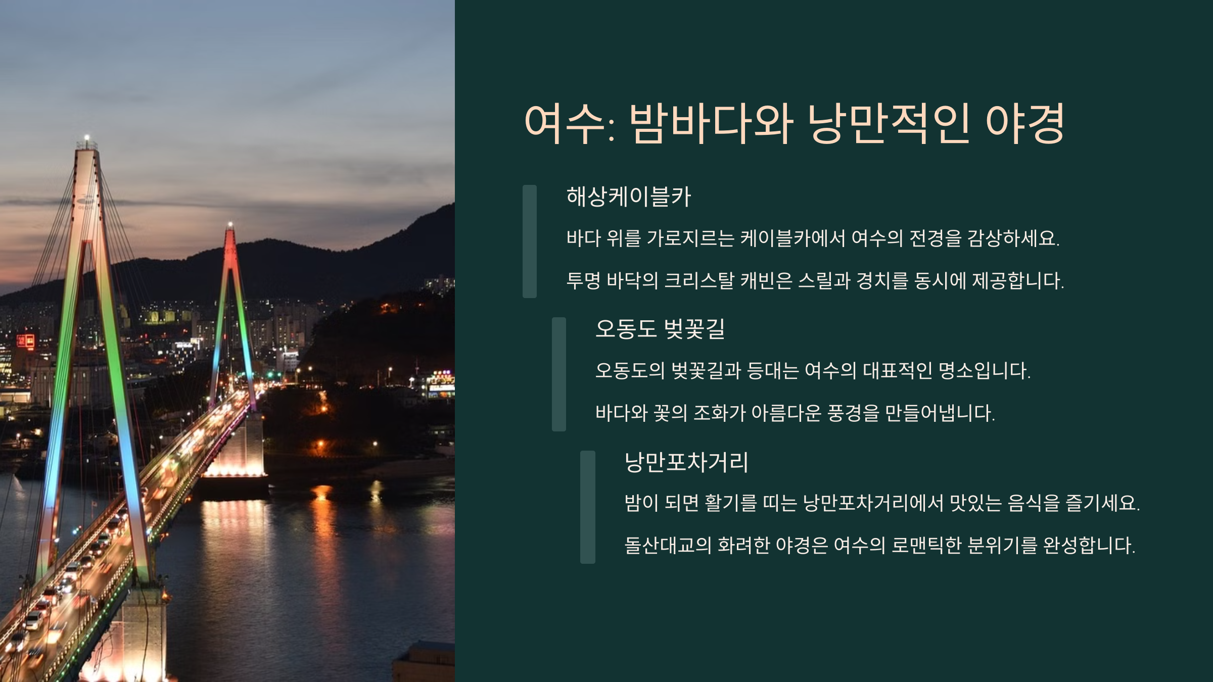 여수는 5월 국내여행지 중에서도 특히 야경으로 유명한 도시입니다. 노래 '여수 밤바다'로 더욱 알려진 이곳은 밤이 되면 항구에 반짝이는 불빛들이 바다에 반사되어 환상적인 풍경을 만들어냅니다. 돌산대교와 거북선대교의 조명은 여수 밤바다의 낭만을 한층 더 높여줍니다.