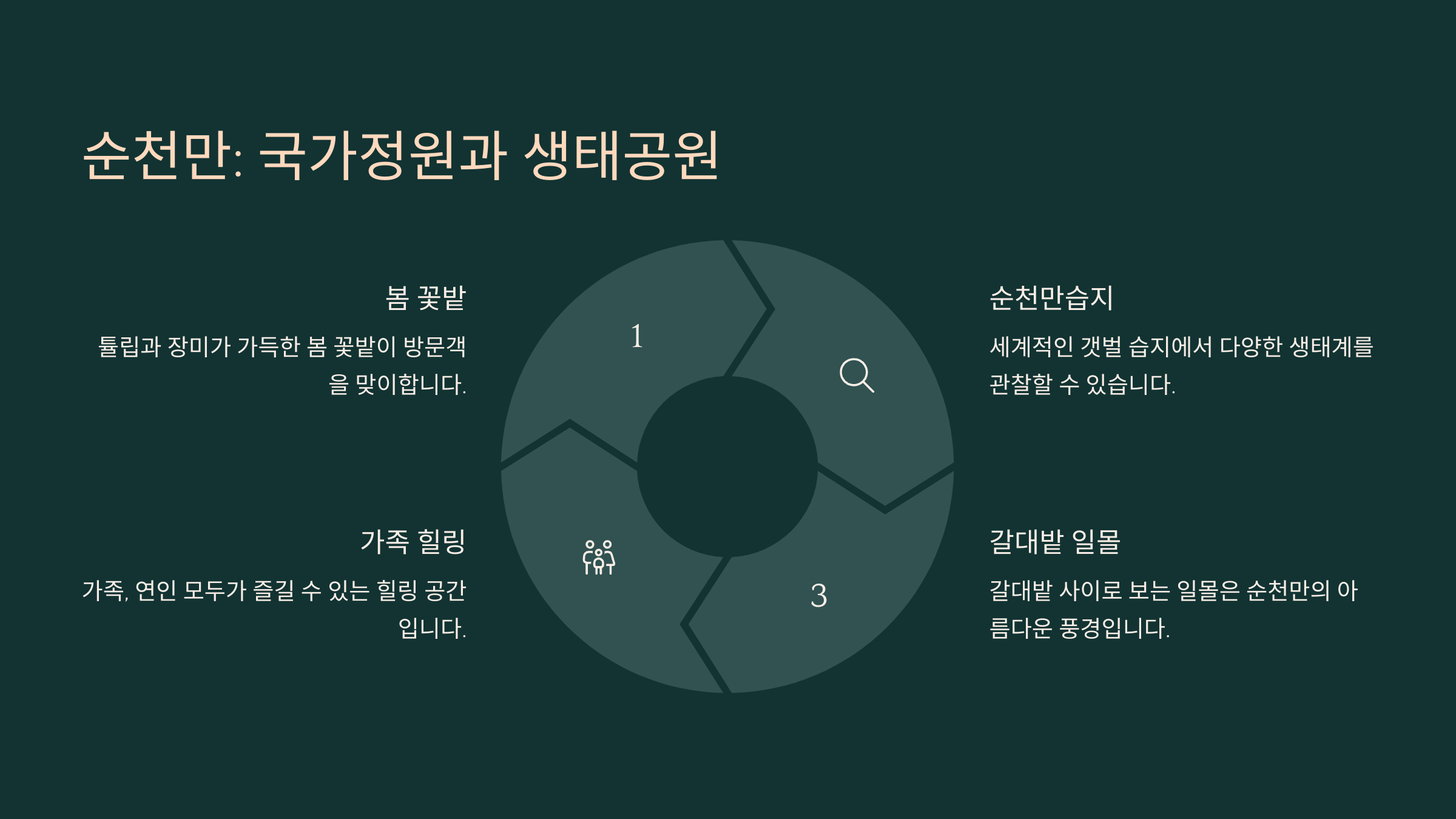 인근의 순천만습지는 국내 최대 규모의 갈대밭으로 유명합니다. 5월은 철새들이 방문하는 시기로, 다양한 조류를 관찰할 수 있는 절호의 기회입니다. 순천만 S자 물길을 따라 조성된 산책로를 걸으며 자연의 아름다움을 만끽할 수 있습니다.