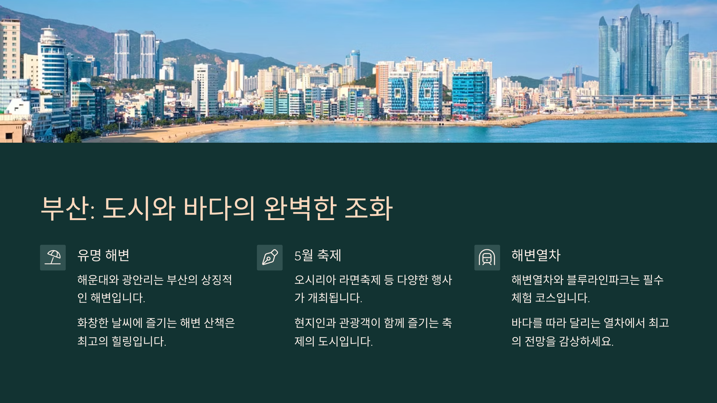 부산은 5월 국내여행지로 항상 인기 있는 곳입니다. 해변과 도시가 멋지게 어우러진 부산은 다양한 매력을 가진 여행지입니다. 해운대 해변은 부산의 대표적인 명소로, 5월의 온화한 날씨에 파도와 모래사장에서 여유로운 시간을 보낼 수 있습니다. 해변가에 늘어선 카페와 레스토랑에서는 바다를 바라보며 휴식을 취할 수 있습니다.