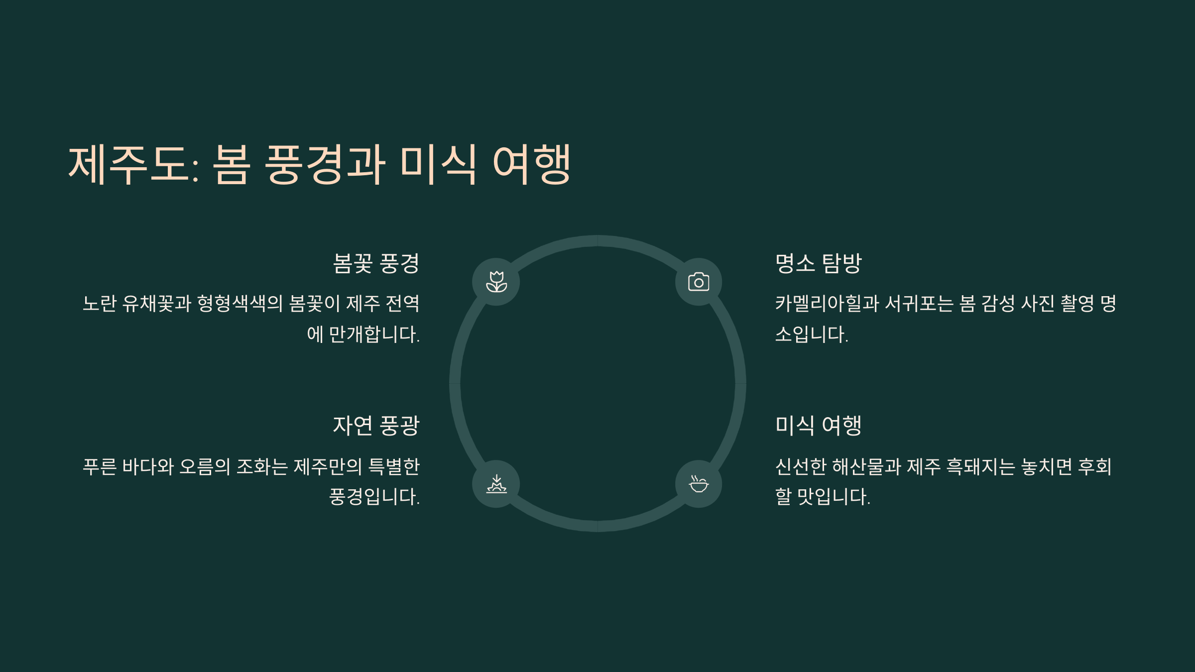 제주도는 계절마다 다른 매력을 보여주지만, 특히 5월의 제주는 유채꽃과 청보리밭이 절정을 이루는 아름다운 시기입니다. 웅장한 한라산을 배경으로 펼쳐지는 봄 풍경은 그야말로 장관입니다. 협재해수욕장과 곽지해수욕장의 에메랄드빛 바다, 우도와 섭지코지의 독특한 자연 경관, 성산일출봉에서 바라보는 전망은 5월 국내여행지로서 제주도의 가치를 높여줍니다.