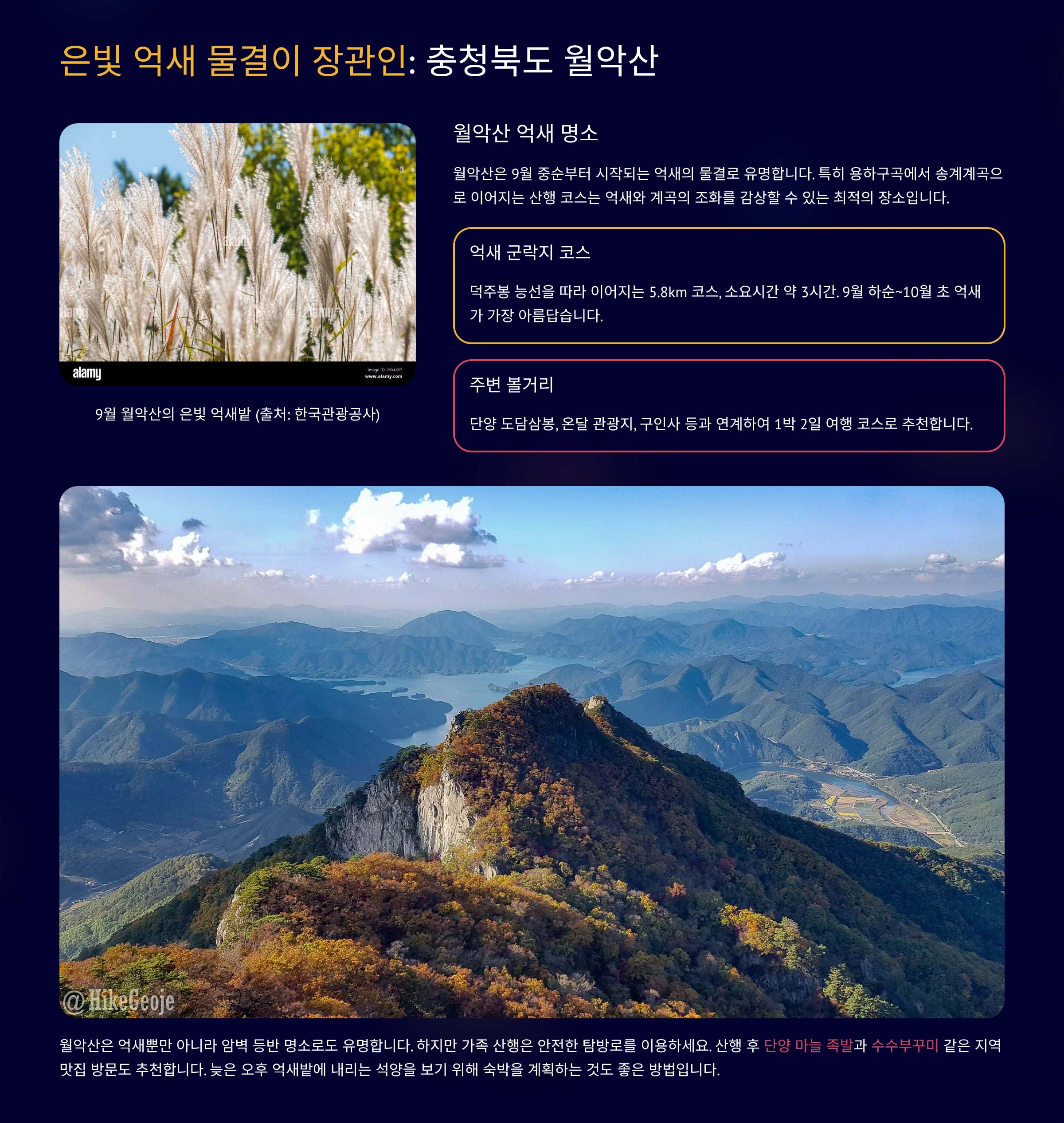 월악산은 수려한 산세와 함께 가을이면 은빛 억새가 장관을 이루는 곳입니다. 특히 9월 중순부터 피기 시작하는 억새는 해 질 녘 노을과 어우러져 환상적인 풍경을 연출합니다.