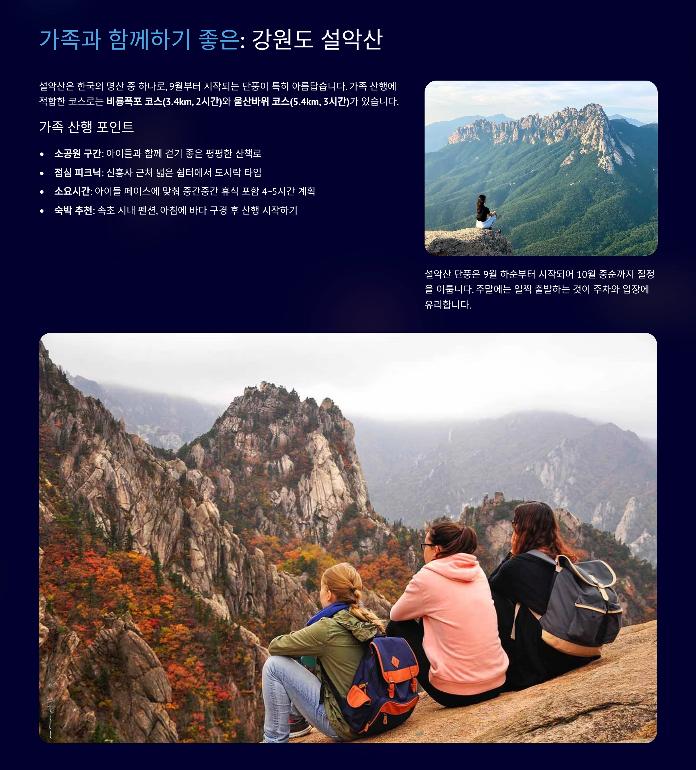 - ✅ 일몰 시간 확인: 9월은 해가 빨리 지므로, 일몰 시간 전에 하산을 완료할 수 있도록 산행 계획을 세워야 합니다.